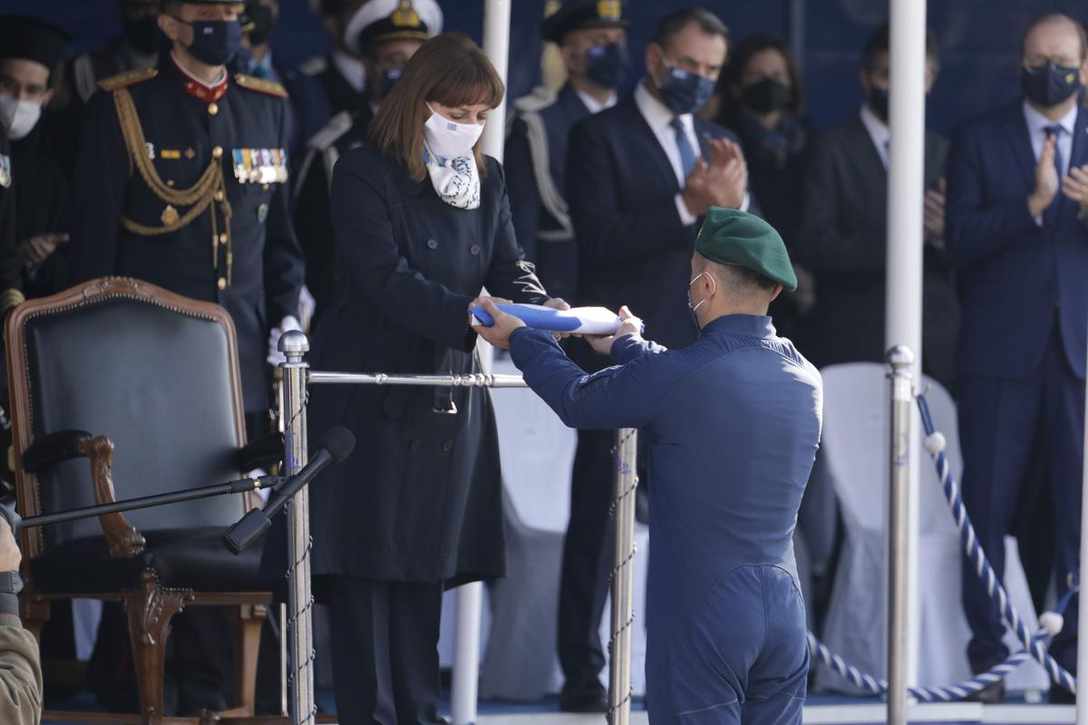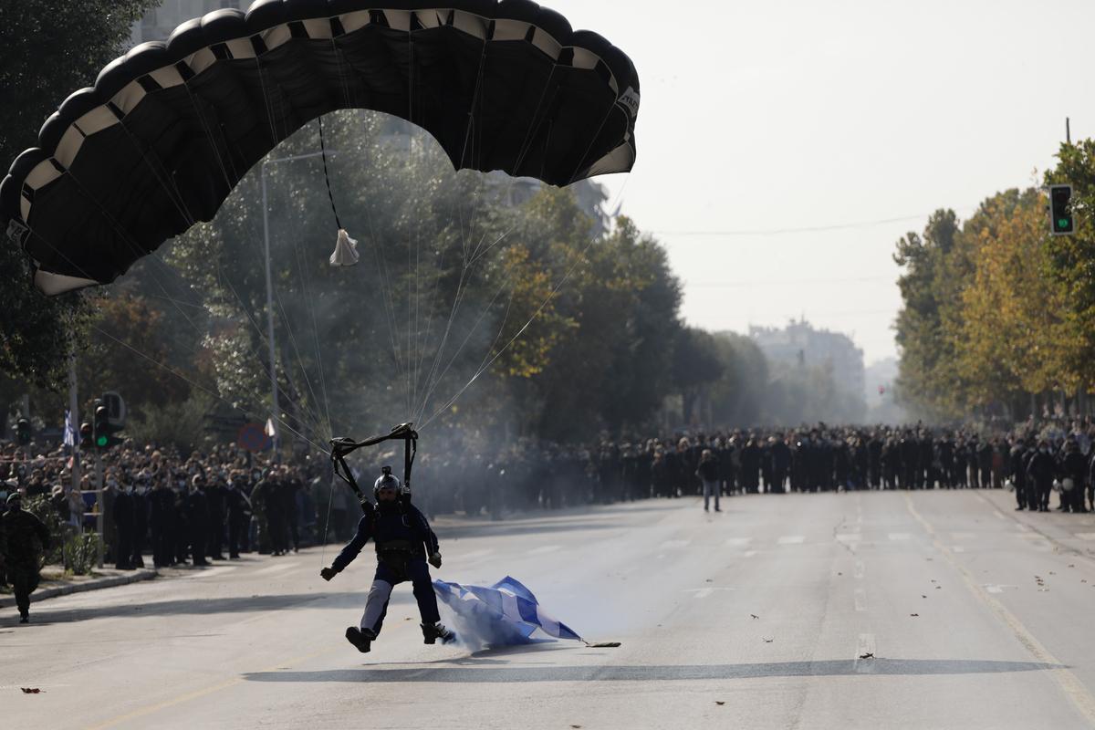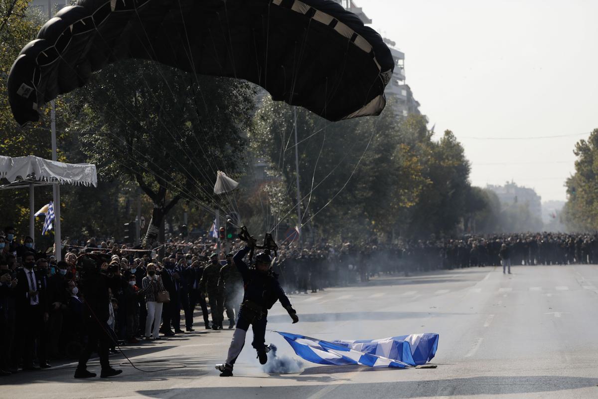 Οι εικόνες από την πτώση των αλεξιπτωτιστών έκοψαν την ανάσα και εντυπωσίασαν όσους βρέθηκαν στη λεωφόρο Μεγάλου Αλεξάνδρου για τη στρατιωτική παρέλαση στη Θεσσαλονίκη. Ο επικεφαλής τους, παρέδωσε στην Πρόεδρο της Δημοκρατίας, Κατερίνα Σακελλαροπούλου την ελληνική σημαία, την οποία, όπως της είπε «έχουμε ορκιστεί να υπερασπιστούμε με την τελευταία ρανίδα του αίματος μας.