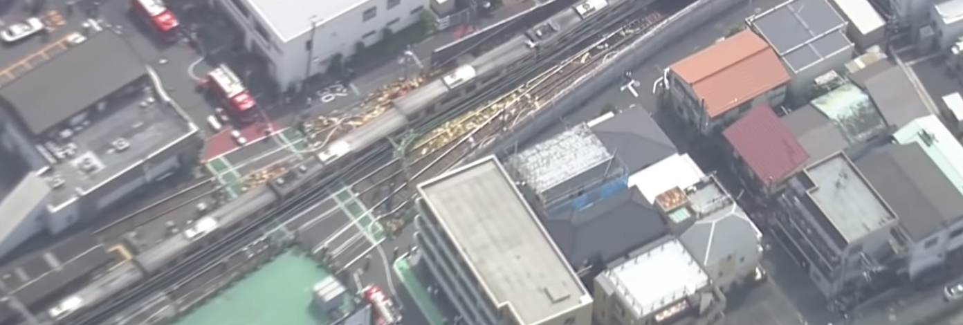 Πλάνα που μετέδωσαν ιαπωνικά ΜΜΕ εικονίζουν μαύρο καπνό να υψώνεται από εκτροχιασμένα βαγόνια του συρμού και ανάστατους επιβάτες που βγαίνουν από το τρένο κοντά σε διασταύρωση των σιδηροτροχιών με το οδικό δίκτυο.