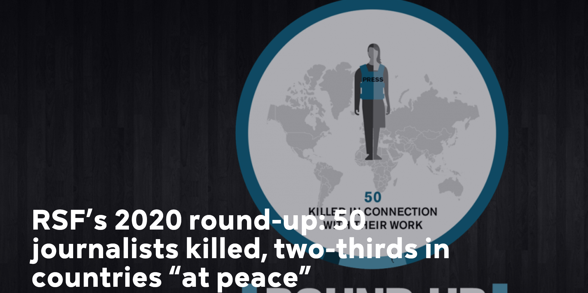 Το 2020 δολοφονήθηκαν πενήντα δημοσιογράφοι, εκ των οποίων σχεδόν οι επτά στους δέκα σε χώρες όπου επικρατεί ειρήνη κι όχι σε εμπόλεμες ζώνες, τονίζει η οργάνωση Δημοσιογράφοι Χωρίς Σύνορα (Reporters sans frontières, RSF) στην ετήσια έκθεσή της, που δίνεται στη δημοσιότητα σήμερα.