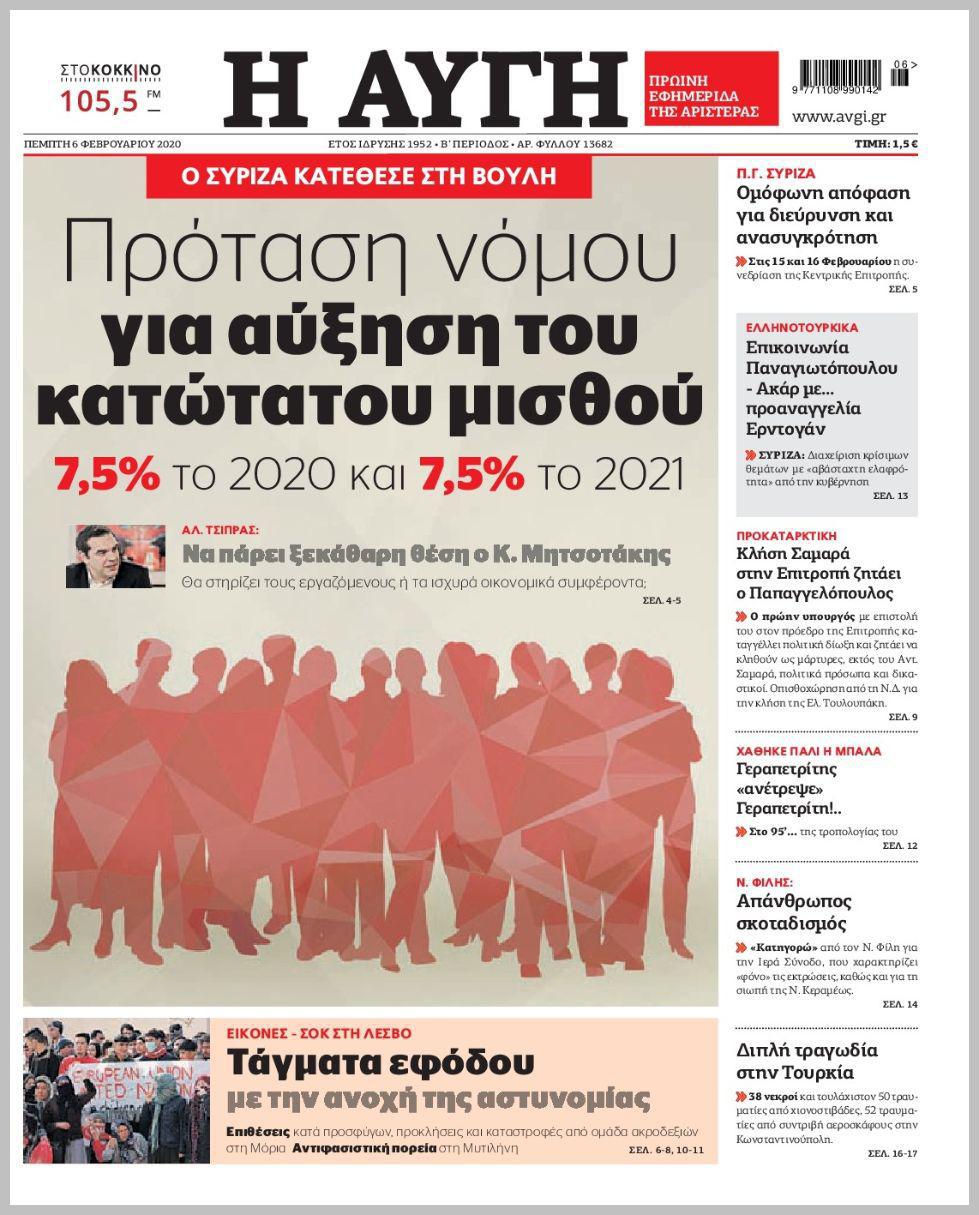 Η ΑΥΓΗ: ” Πρόταση νόμου για αύξηση του κατώτατου μισθού 7,5% το 2020 και 7,5% το 2021 ”