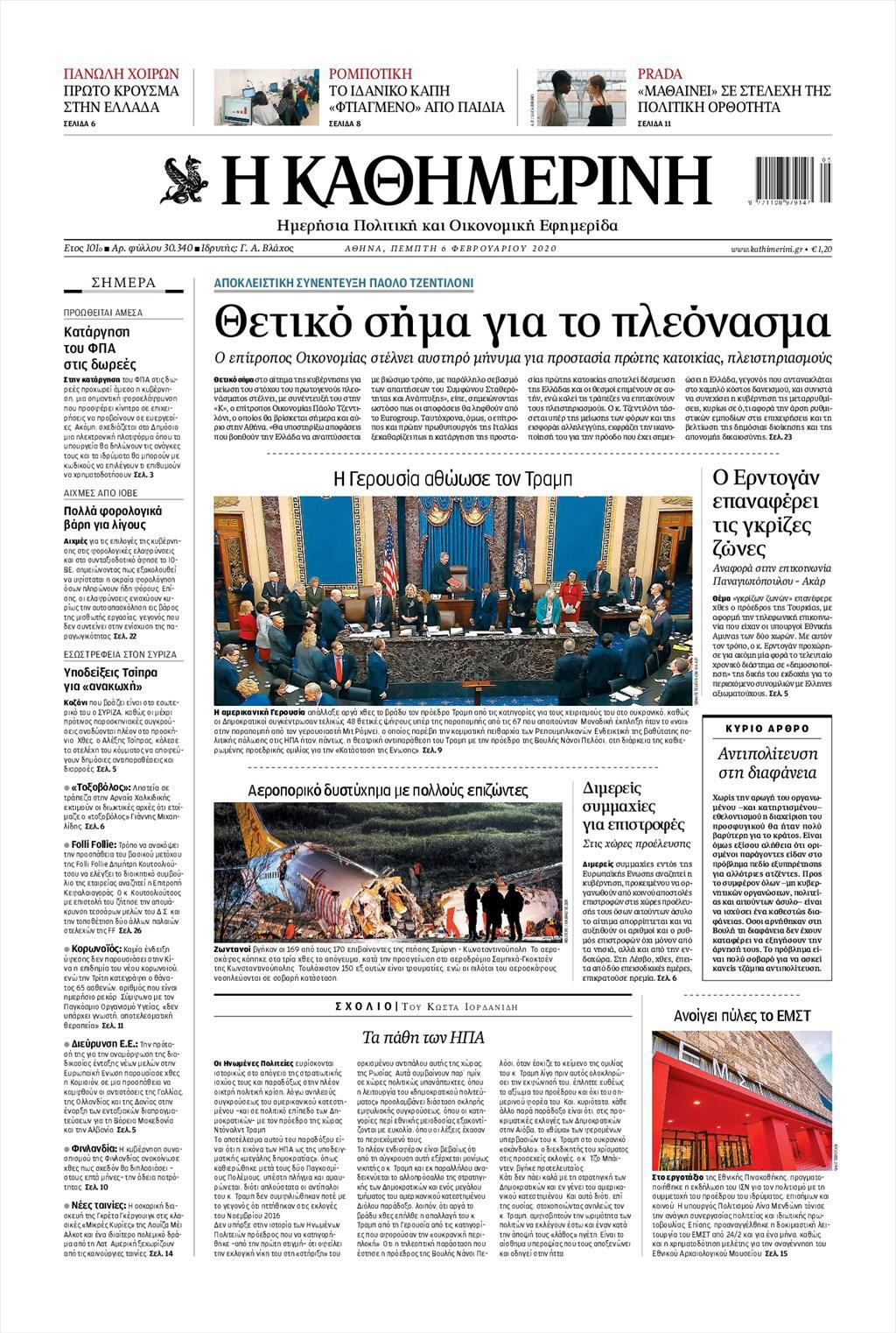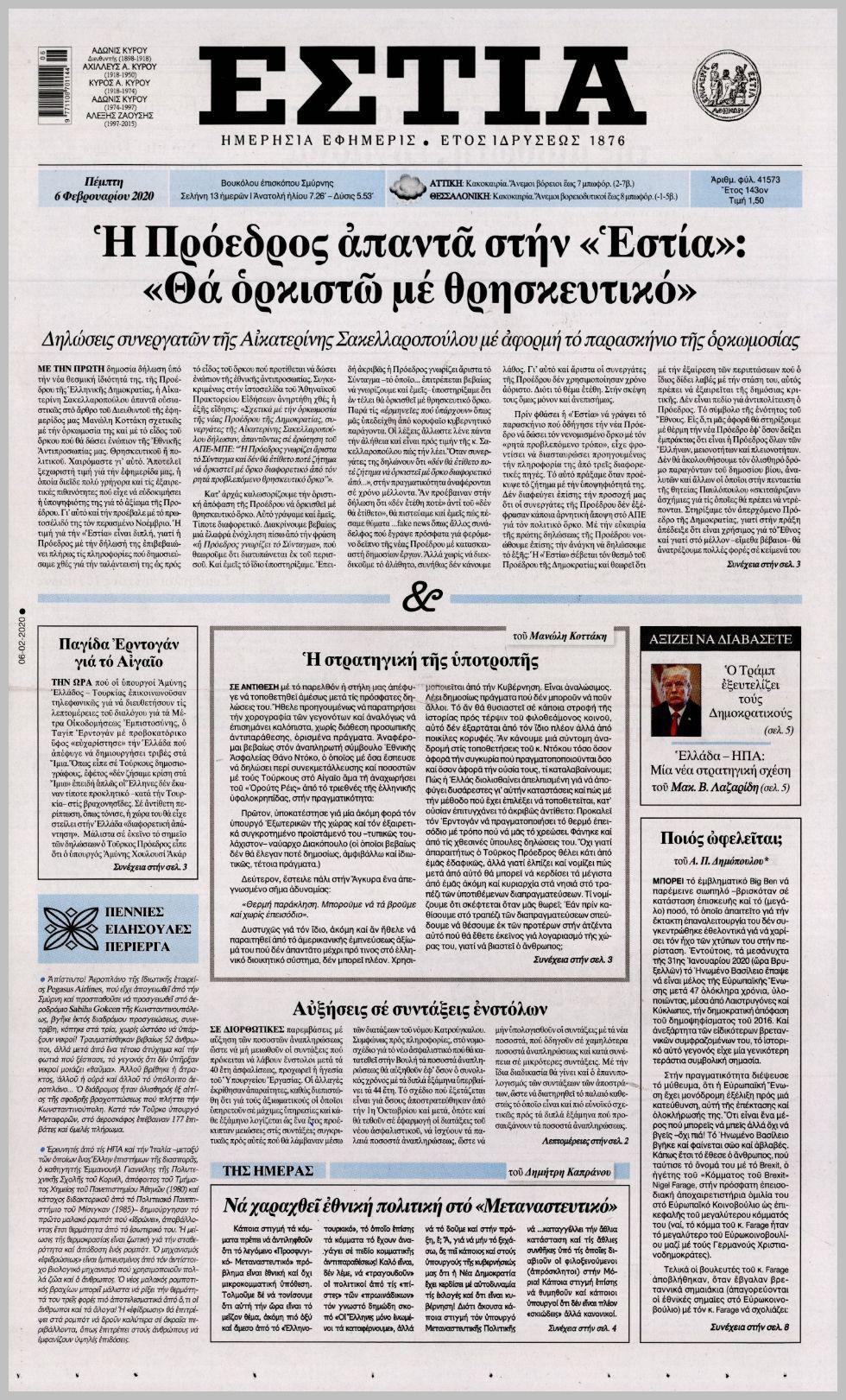 ΕΣΤΙΑ: ” Η Πρόεδρος απαντά στην “Εστία”: “Θα ορκιστώ με θρησκευτικό” ” Η ΚΑΘΗΜΕΡΙΝΗ: ” Θετικό σήμα για το πλεόνασμα ”