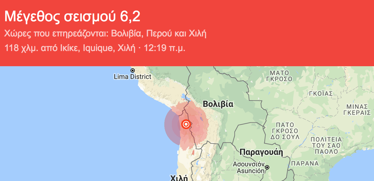 Ο σεισμός σημειώθηκε στις 19:21 τοπική ώρα (00:21 ώρα Ελλάδας) σε μια περιοχή 38 χιλιόμετρα νότια της κοινότητας Καμίνια, στην περιφέρεια Ταραπακά, 1.800 χλμ. βόρεια του Σαντιάγο.