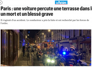 Un homme en voiture a percuté une terrasse de café à Paris (17ème) faisant un mort et plusieurs blessés. L’auteur est en fuite. Il pourrait s’agir d’un accident selon les premières constatations. A confirmer. pic.twitter.com/VSYpyPVOHU