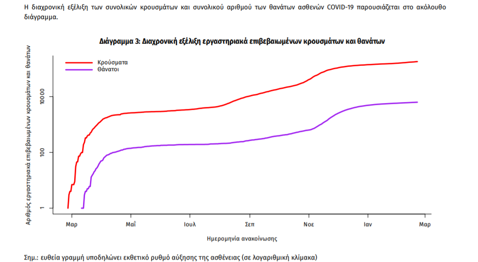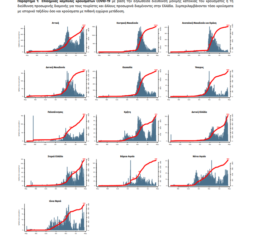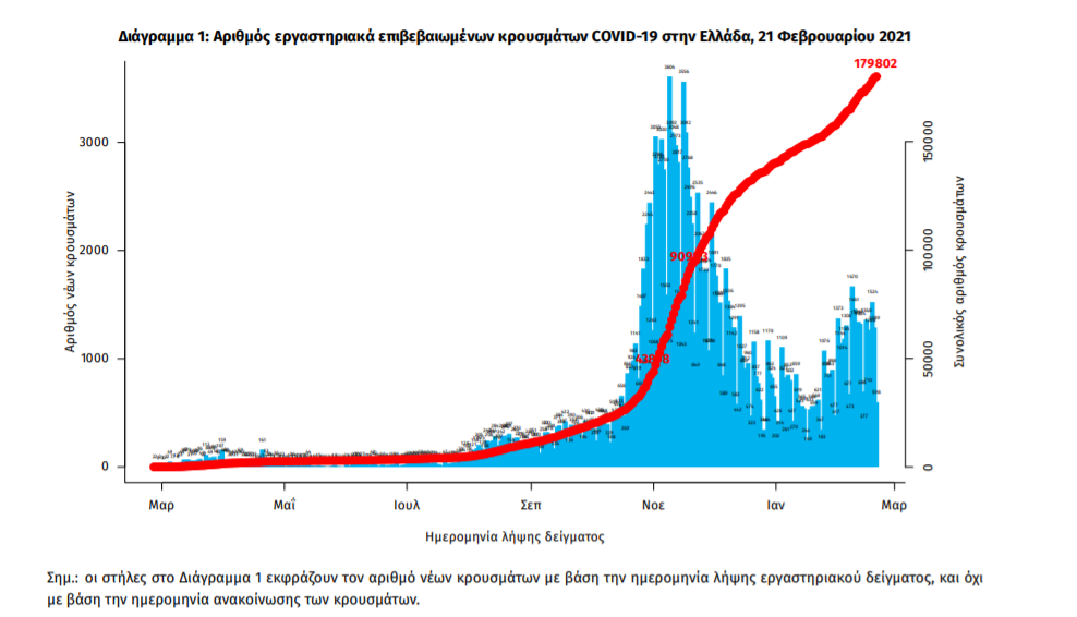 Τα νέα εργαστηριακά επιβεβαιωμένα κρούσματα της νόσου που καταγράφηκαν τις τελευταίες 24 ώρες είναι 884, εκ των οποίων 7 εντοπίστηκαν κατόπιν ελέγχων στις πύλες εισόδου της χώρας. Ο συνολικός αριθμός των κρουσμάτων ανέρχεται σε 179.802 (ημερήσια μεταβολή +0.5%), εκ των οποίων 51.8% άνδρες. Με βάση τα επιβεβαιωμένα κρούσματα των τελευταίων 7 ημερών, 46 θεωρούνται σχετιζόμενα με ταξίδι από το εξωτερικό και 2.417 είναι σχετιζόμενα με ήδη γνωστό κρούσμα. Ημερήσια εξέλιξη της πανδημίας: Η ημερήσια κατανομή των επιβεβαιωμένων κρουσμάτων είναι η ακόλουθη (η γραμμή παριστάνει την συνολική, αθροιστική κατανομή των κρουσμάτων).