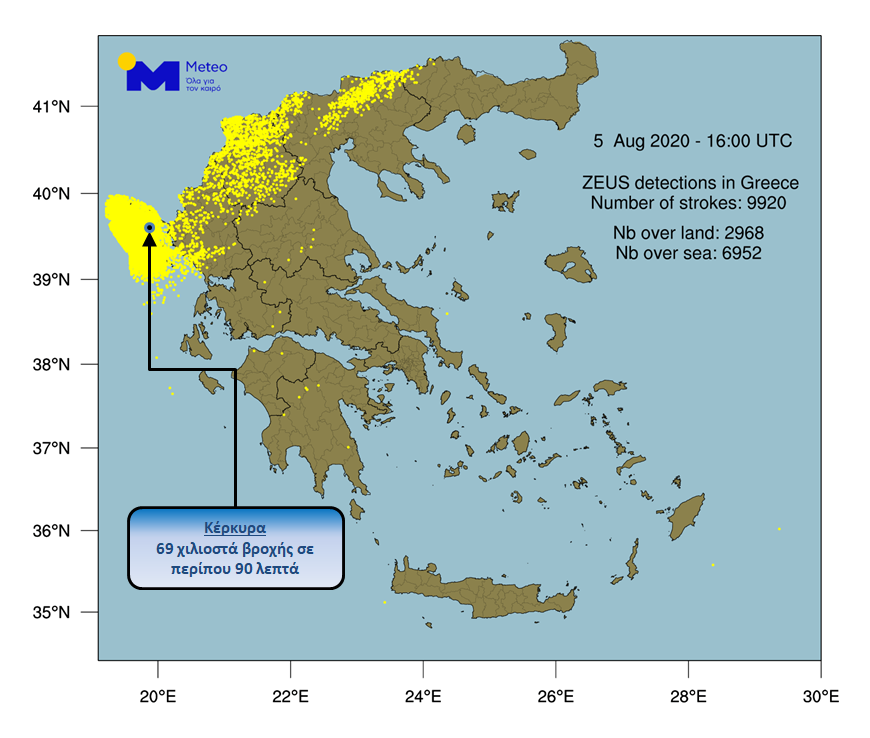 9900 κεραυνοί καταγράφηκαν στη Βορειοδυτική Ελλάδα από το σύστημα «ΖΕΥΣ» του Εθνικού Αστεροσκοπείου Αθηνών έως το απόγευμα της Τετάρτης 5 Αυγούστου, όπως φαίνεται και στο χάρτη που ακολουθεί. Βροχές και καταιγίδες σημειώθηκαν κυρίως στο Ιόνιο, στη Μακεδονία, στην Ήπειρο και στη Θεσσαλία.