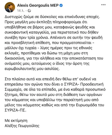 «Δυστυχώς ζούμε σε δύσκολες και επικίνδυνες εποχές. Προς μεγάλη μου έκπληξη πληροφορούμαι ότι υποβλήθηκε σε βάρος μου, καταφανώς ψευδής και συκοφαντική καταγγελία, για περιστατικό που δήθεν συνέβη πριν τρία χρόνια. Απέναντι σε αυτήν την ψευδή και προσβλητική επίθεση, που πραγματοποιείται – μάλλον όχι τυχαία – λίγες ημέρες πριν τις εθνικές εκλογές, προτίθεμαι να δώσω τη μάχη μου στη δικαιοσύνη, για την αλήθεια και την αποκατάσταση του ονόματός μου, αιτούμενος ο ίδιος την άρση της ευρωβουλευτικής μου ασυλίας.