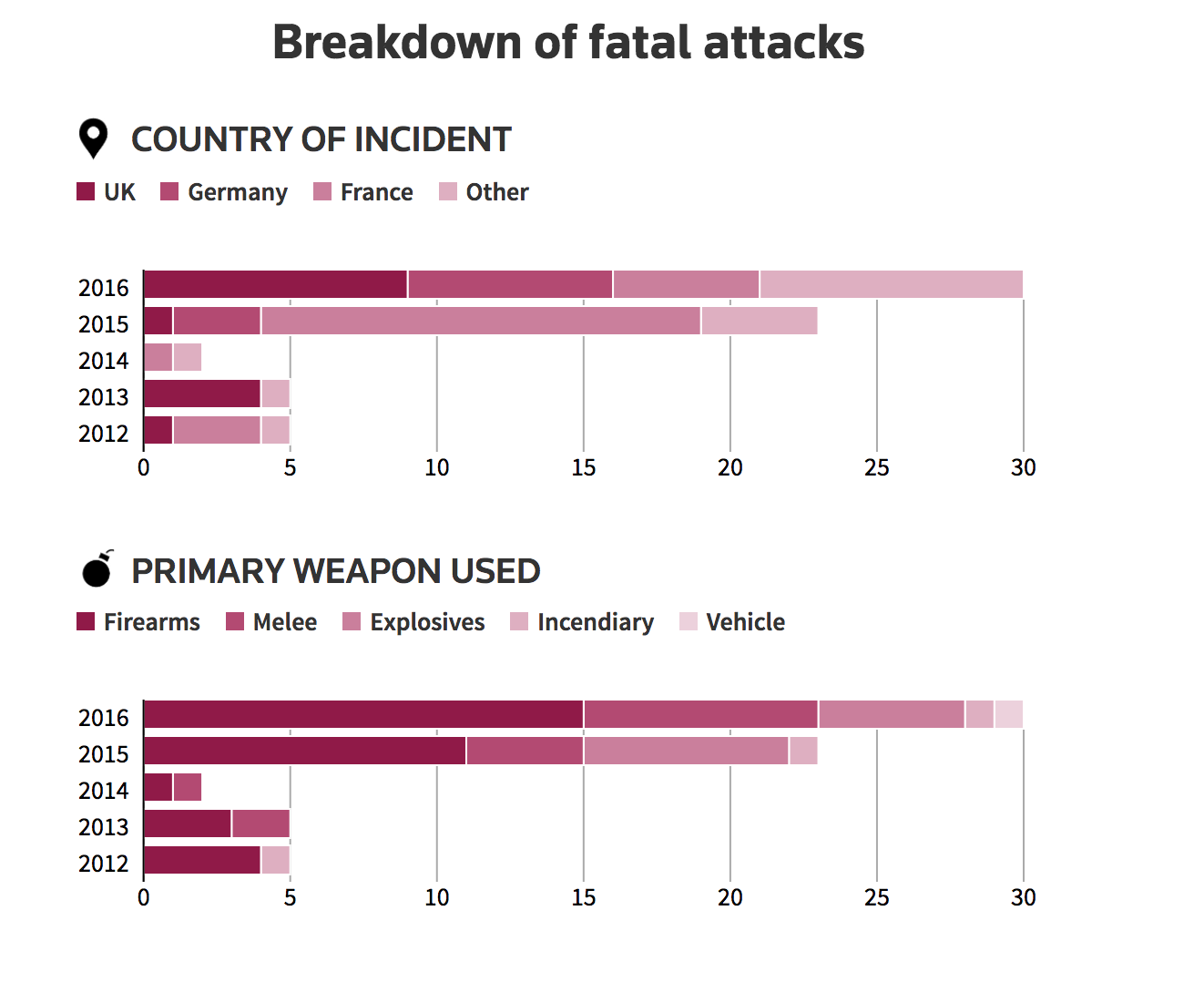 Σύμφωνα με ειδικούς το ΙΚ, στο οποίο αποδόθηκε η ευθύνη για επτά από τις 10 πιο πολύνεκρες επιθέσεις μετά το 2012, ενθαρρύνει όλο και περισσότερο τη χρήση μαχαιριών και αυτοκινήτων αντί των πυροβόλων όπλων και των εκρηκτικών από τους οπαδούς του.