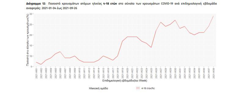 Την τελευταία εβδομάδα το σύνολο των ασθενών ηλικίας 4-18 ετών είναι 4.026 και αποτελούν το 29% (+21% από την προηγούμενη εβδομάδα) στο σύνολο των κρουσμάτων πανελλαδικά.