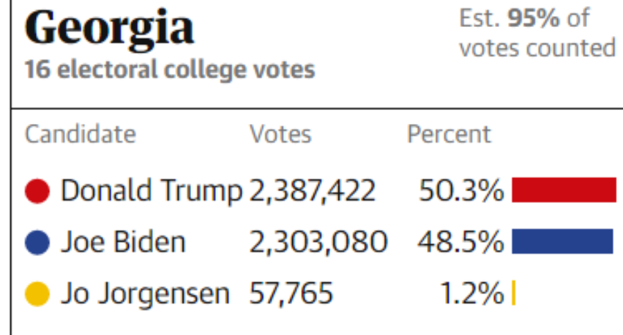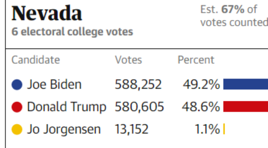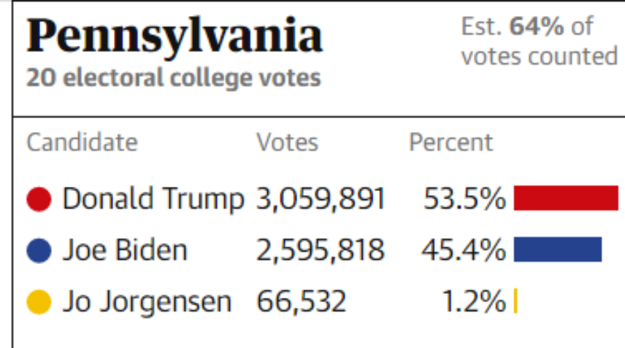 Σύμφωνα με τα αμερικανικά μέσα ενημέρωσες, οι ψήφοι που απομένουν να καταμετρηθούν είναι κυρίως επιστολικές και θεωρείται ότι θα ευνοήσουν τον Μπάιντεν.