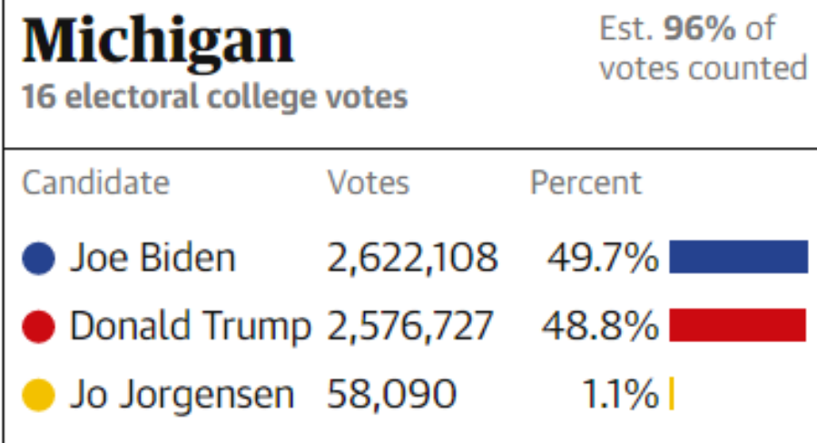 Εάν κερδίσει το Μίσιγκαν, το Γουισκόνσιν και τη Νεβάδα (16+10+6), ο Μπάιντεν θα εξασφαλίσει τους 32 εκλέκτορες που του χρειάζονται για να φτάσει στον «μαγικό αριθμό» των 270.