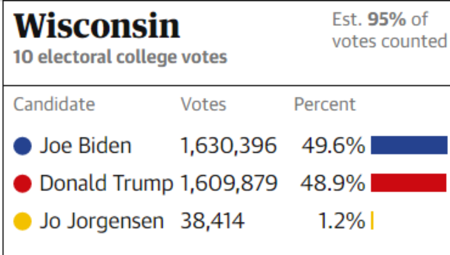 Σύμφωνα με την εταιρεία δημοσκοπήσεων Edison Research, στο Γουισκόνσιν, με καταμετρημένο το 99% των ψήφων, ο Τζο Μπάιντεν προηγείται με ποσοστό 49,4%, έναντι 48,8% του Τραμπ. Δεδομένου ότι η διαφορά τους είναι μικρότερη της 1 μονάδας, ο απερχόμενος πρόεδρος δικαιούται να ζητήσει να καταμετρηθούν ξανά οι ψήφοι.