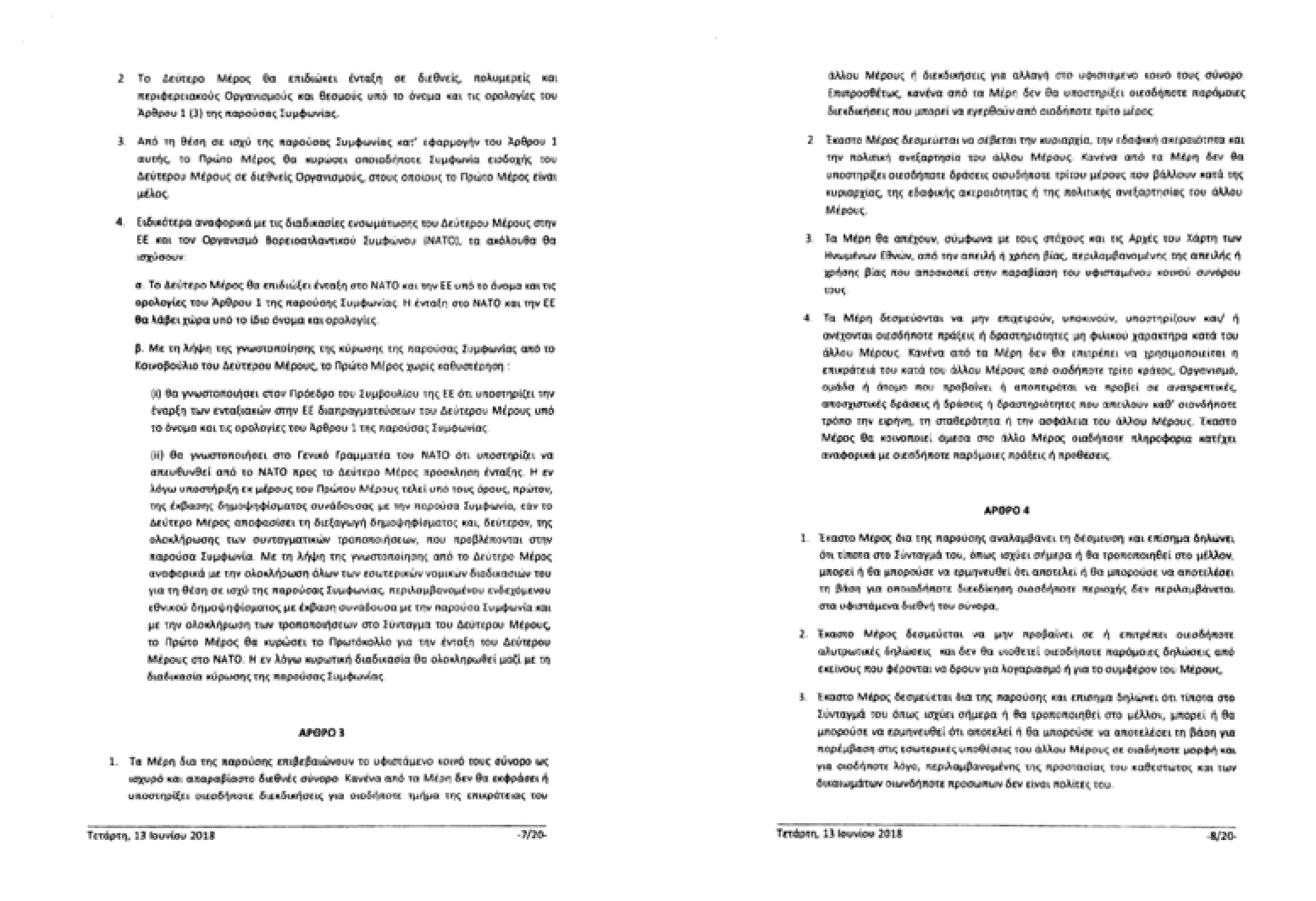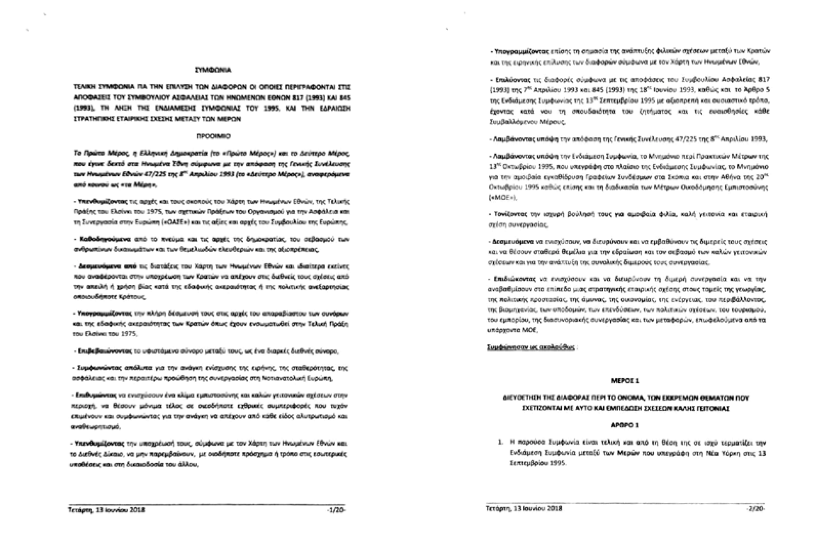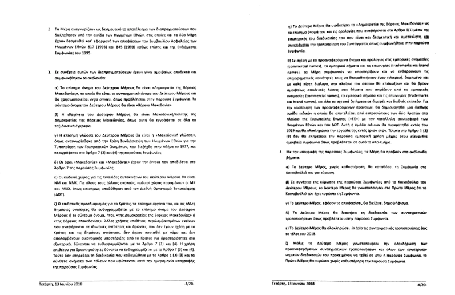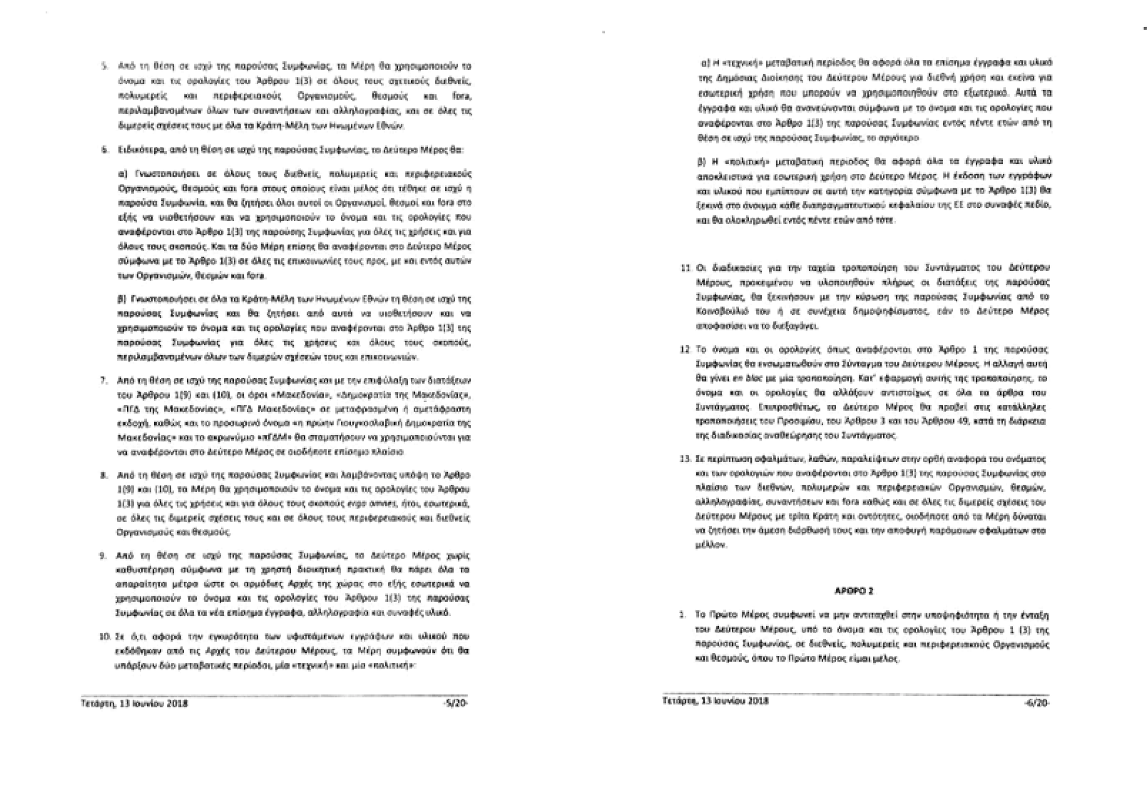 «Σε συνέχεια αυτών των διαπραγματεύσεων έχουν γίνει αμοιβαίως αποδεκτά και συμφωνήθηκαν τα ακόλουθα: α) Το επίσημο όνομα του Δευτέρου Μέρους θα είναι “Δημοκρατία της Βόρειας Μακεδονίας”, το οποίο θα είναι το συνταγματικό όνομα του Δεύτερου Μέρους και θα χρησιμοποιείται erga omnes, όπως προβλέπεται στην παρούσα Συμφωνία. Το σύντομο όνομα του Δεύτερου Μέρους θα είναι “Βόρεια Μακεδονία”.