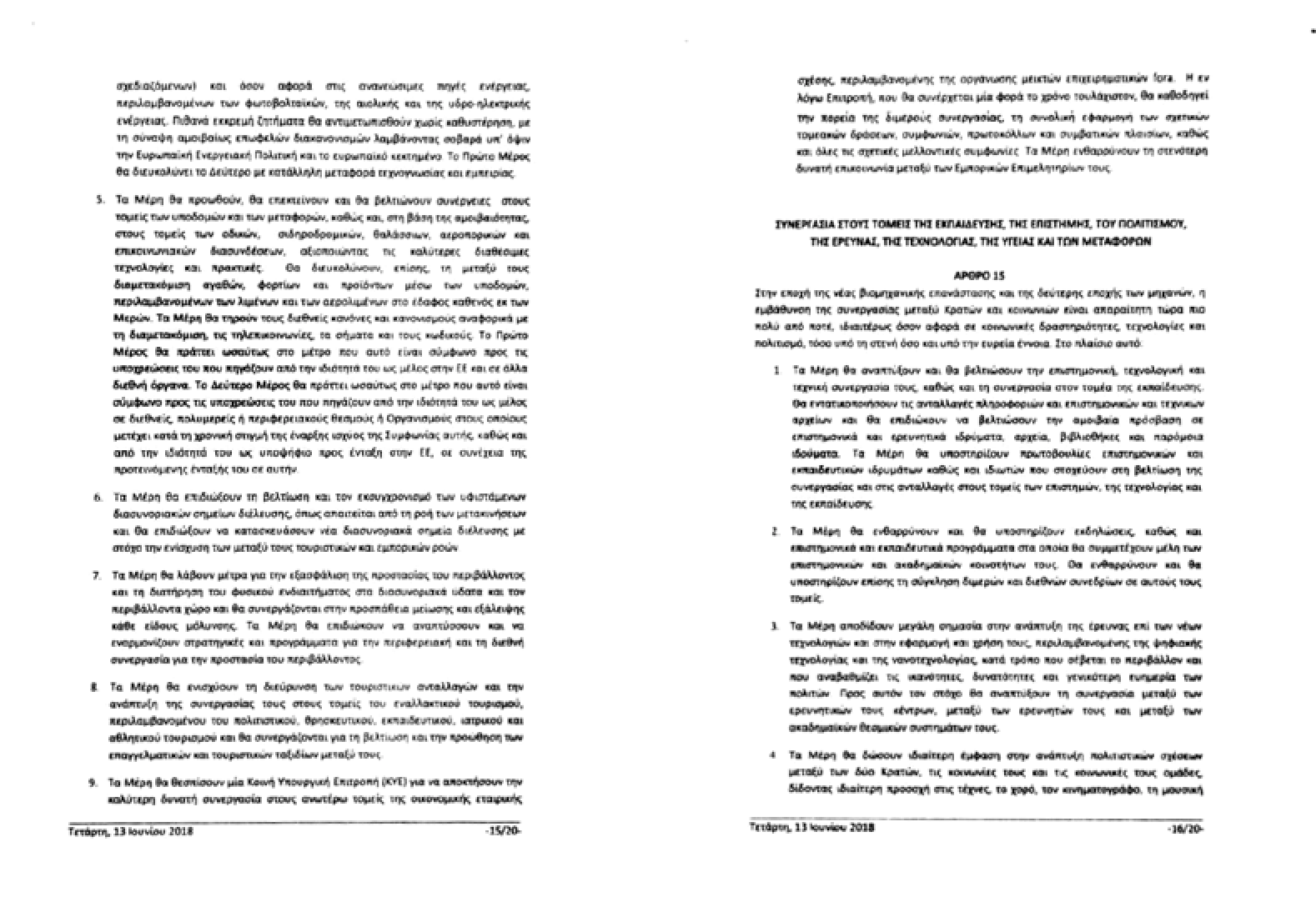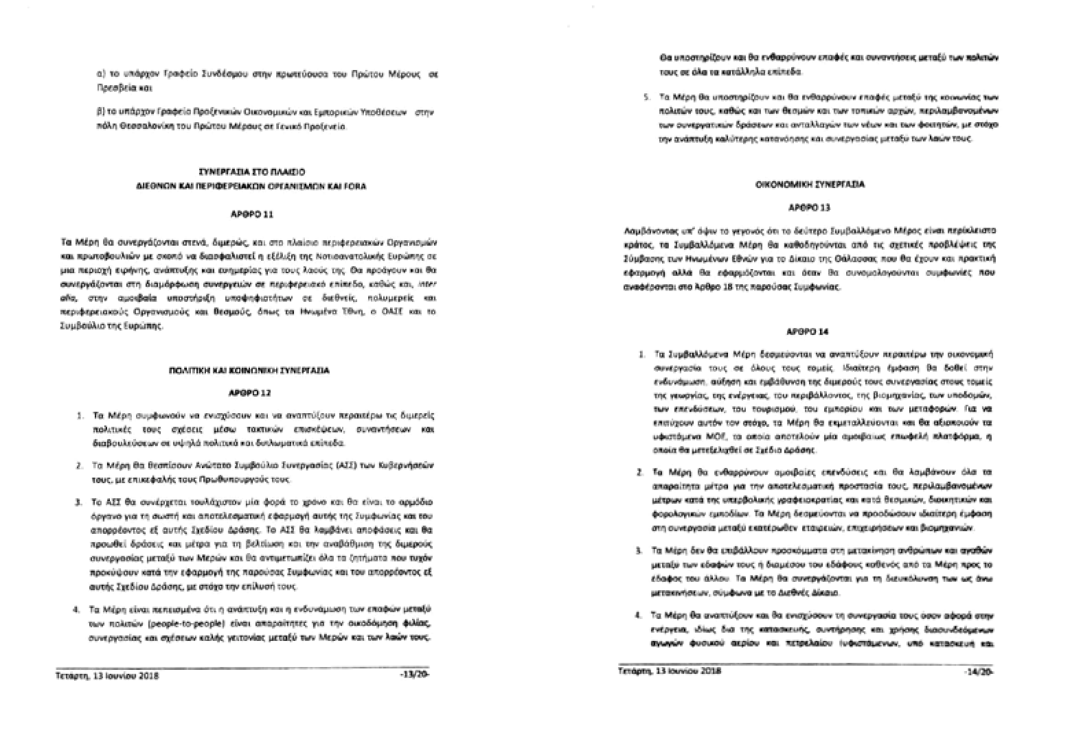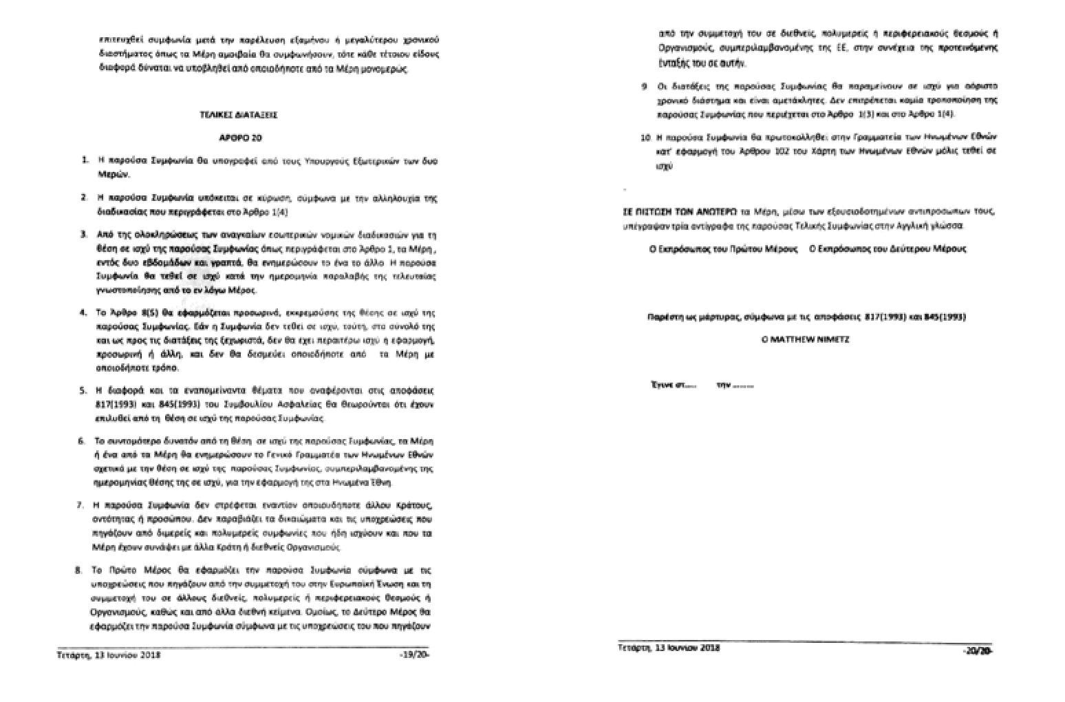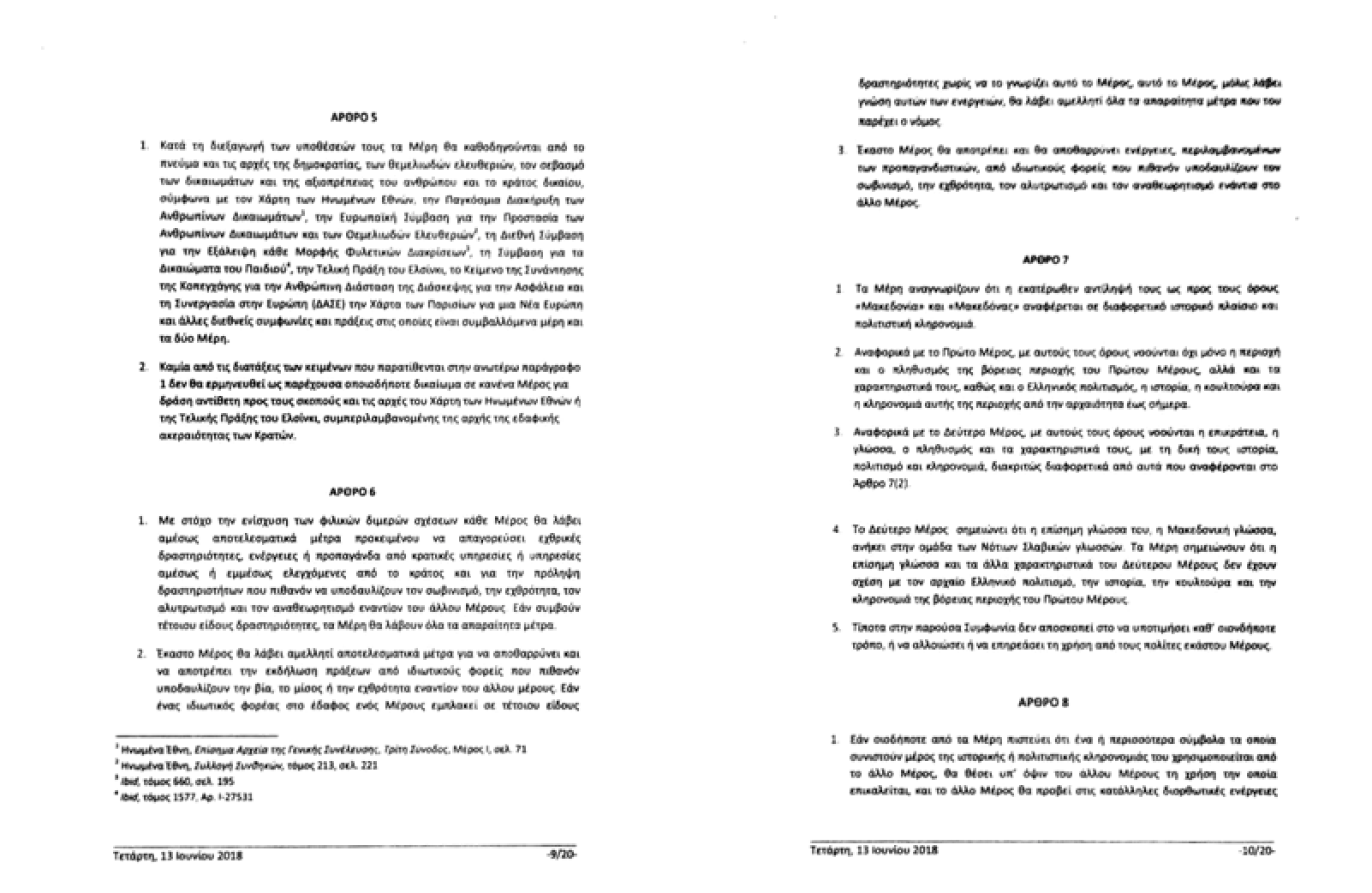 «Σε συνέχεια αυτών των διαπραγματεύσεων έχουν γίνει αμοιβαίως αποδεκτά και συμφωνήθηκαν τα ακόλουθα: α) Το επίσημο όνομα του Δευτέρου Μέρους θα είναι “Δημοκρατία της Βόρειας Μακεδονίας”, το οποίο θα είναι το συνταγματικό όνομα του Δεύτερου Μέρους και θα χρησιμοποιείται erga omnes, όπως προβλέπεται στην παρούσα Συμφωνία. Το σύντομο όνομα του Δεύτερου Μέρους θα είναι “Βόρεια Μακεδονία”.