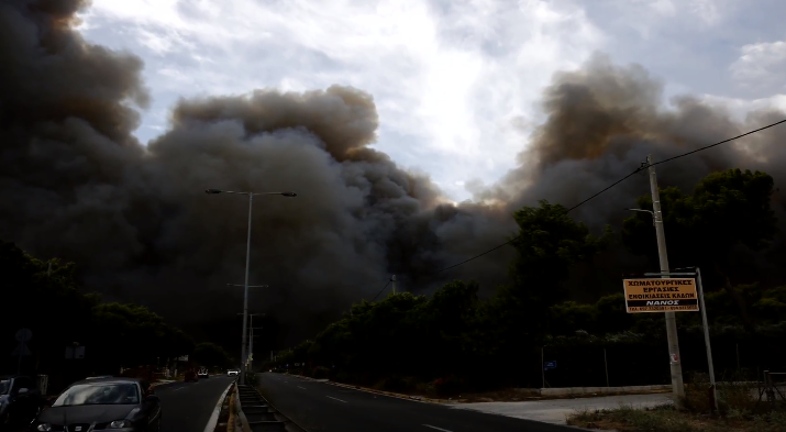 Ο φωτορεπόρτερ του ΑΠΕ-ΜΠΕ, ξαφνικά βρίσκεται μέσα σε πυκνούς καπνούς που, όπως λέει, έκαναν αδύνατη την οπτική πλέον δυνατότητα αλλά και τον δυσκόλευαν στην αναπνοή. Αναγκάζεται να αφήσει το μηχανάκι του και να φύγει με περαστικό αυτοκίνητο προς τη Νέα Μάκρη. Για εκείνον ήταν προφανές ότι η φωτιά θα περνούσε τη Λεωφόρο Μαραθώνος καθώς ήδη έβλεπε μικρές εστίες να δημιουργούνται στην απέναντι πλευρά.
