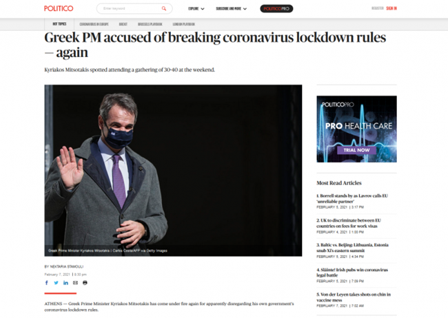 Αντίστοιχο δημοσίευμα υπάρχει και στο Ρolitico με τίτλο: “Ο Έλληνας πρωθυπουργός κατηγορείται για παραβίαση των περιοριστικών μέτρων και πάλι”