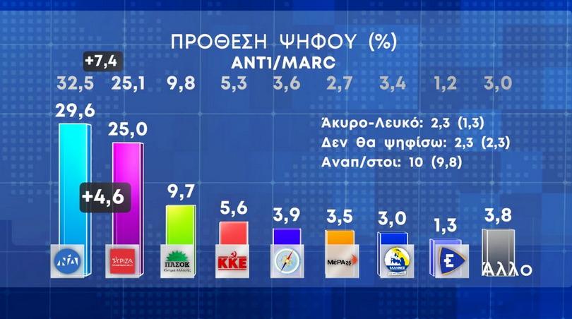 Συγκεκριμένα, στην πρόθεση ψήφου στη δημοσκόπηση της Marc, η Νέα Δημοκρατία, καταγράφει 29,6% και ακολουθεί ο ΣΥΡΙΖΑ, με 25%. Το ΠΑΣΟΚ, είναι τρίτο με ποσοστό 9,7% και στη συνέχεια το ΚΚΕ, με 5,6%, η Ελληνική Λύση, με 3,9%, το ΜεΡΑ25, με 3,5% και το Εθνικό Κόμμα Έλληνες, με 3%. Οι αναποφάσιστοι φτάνουν στο 10%.