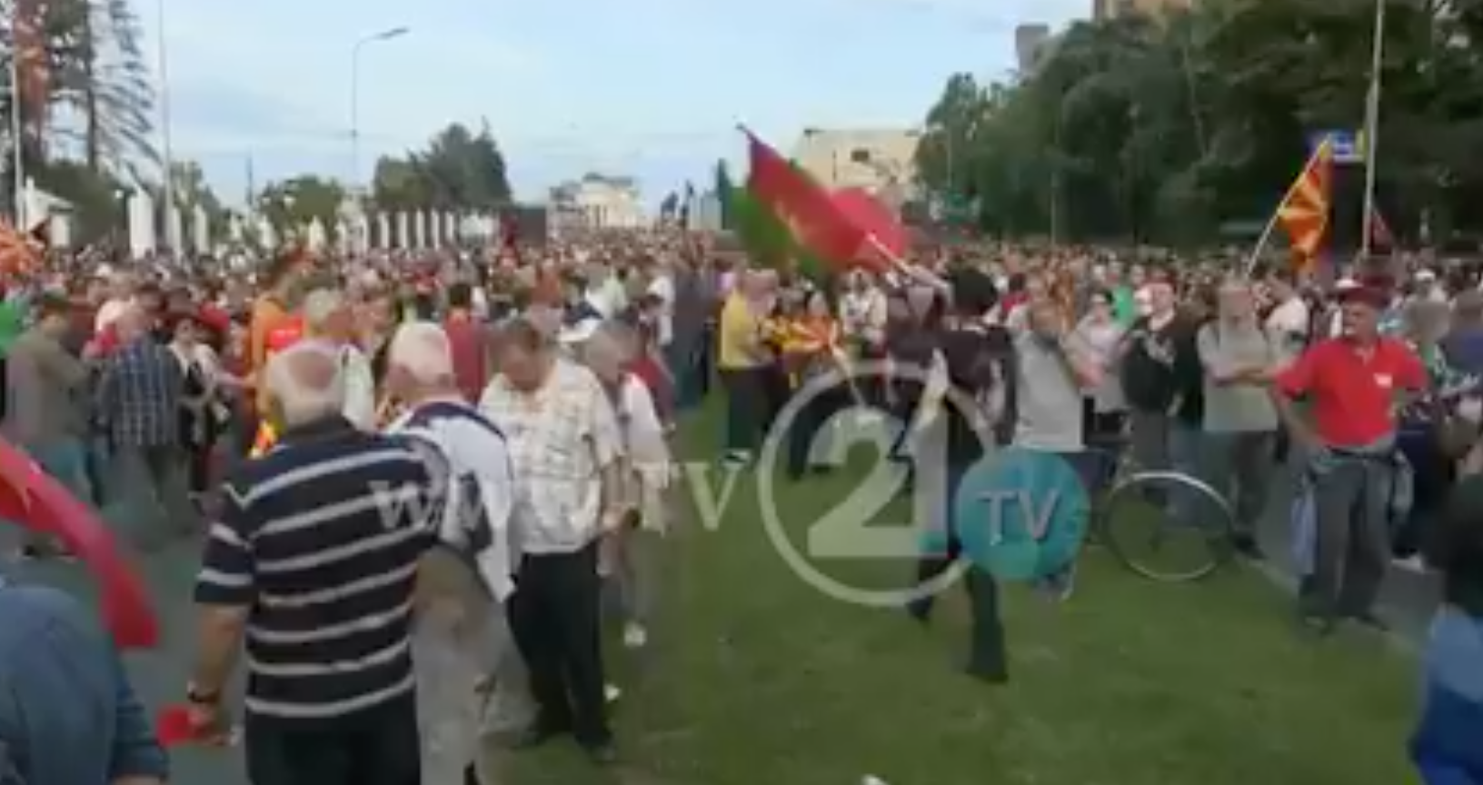 Οι διαδηλωτές είχαν συγκεντρωθεί έξω από το κτίριο της κυβέρνησης στα Σκόπια κρατώντας σημαίες της χώρας, ενώ κάποιοι είχαν πανό που έγραφαν: «Η Μακεδονία θα κερδίσει».