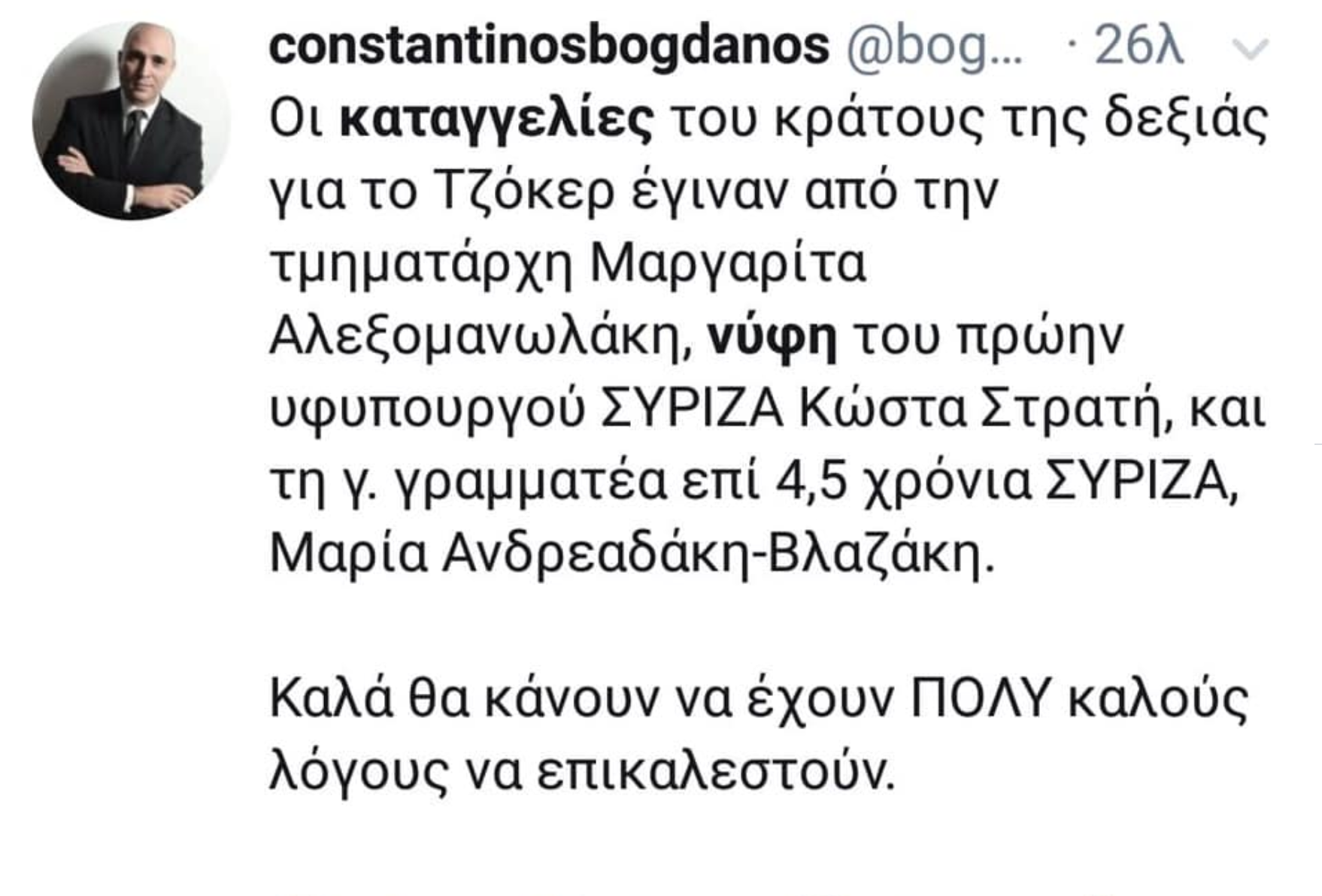 Σήμερα το πρωί ο βουλευτής της Ν.Δ. Κωνστναντίνος Μπογδάνος σε μια ακόμα πρωτοφανή κίνηση από αυτές που μας έχει συνηθίσει έγραψε:
