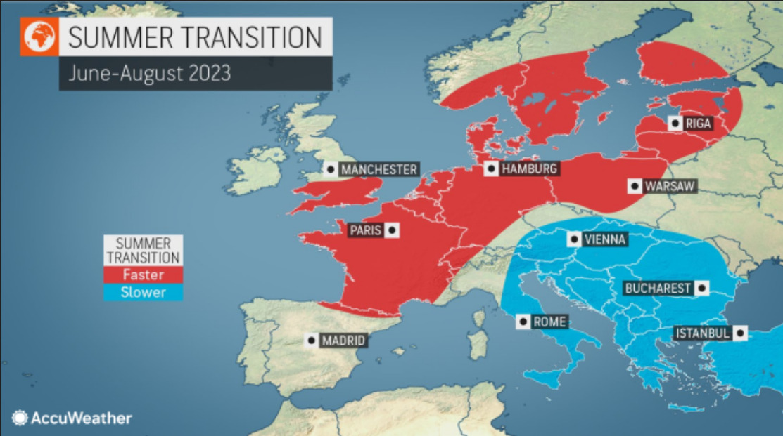 Οι μετεωρολόγοι της AccuWeather αναφέρουν ότι ο καλοκαιρινός καιρός θα ξεκινήσει γρήγορα σε όλη την κεντρική και βόρεια Ευρώπη, ενώ οι νοτιοανατολικές περιοχές ενδέχεται να αντιμετωπίσουν μια πιο αργή μετάβαση στη νέα σεζόν.