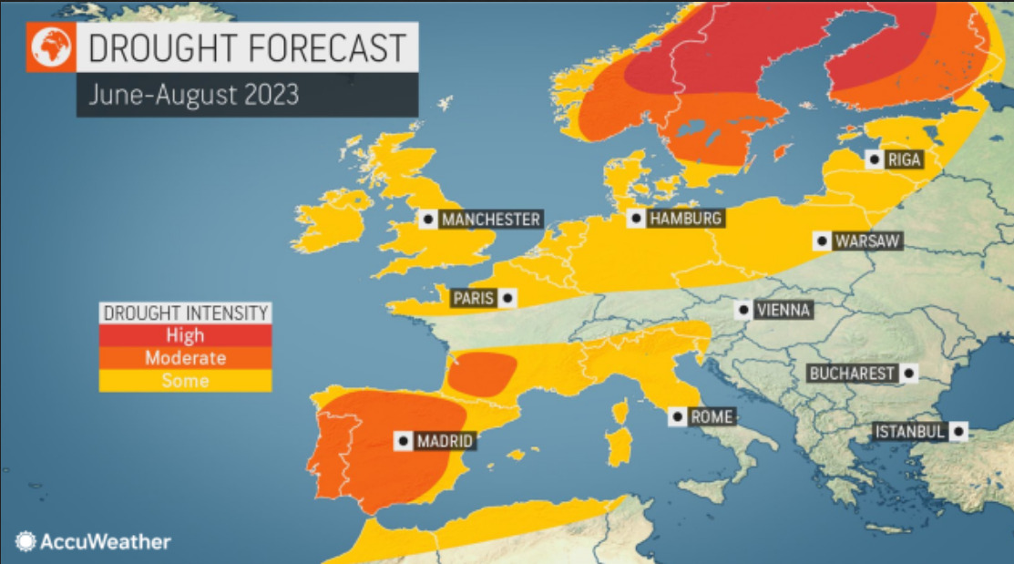 Όσον αφορά την Ισπανία, την Πορτογαλία, καθώς και τα νότια τμήματα της Γαλλίας, ενδέχεται να έχουν ικανοποιητικές βροχοπτώσεις κατά την διάρκεια της καλοκαιρινής περιόδου, επισημαίνοντας ωστόσο οι μετεωρολόγοι ότι δεν θα βελτιώσουν τις ήδη υπάρχουσες συνθήκες ξηρασίας που επικρατούν το τελευταίο διάστημα, καθώς οι καταιγίδες στην διάρκεια του καλοκαιριού εναποθέτουν στο έδαφος μεγάλο όγκο νερού μέσα σε σύντομο χρονικό διάστημα, με αποτέλεσμα οι υδροφόροι ορίζοντες να μην προλαβαίνουν να αποθηκεύσουν σημαντική ποσότητα νερού.