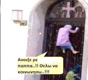 Μάλιστα, ο Αμβρόσιος επέλεξε να βάλει στο εξώφυλλο μία φωτογραφία που είχε γίνει viral κι απεικόνιζε μία ηλικιωμένη που ήταν σκαρφαλωμένη σε κλειστή πόρτα εκκλησίας με τη λεζάντα «παπά, άνοιξε την πόρτα, θέλω να κοινωνήσω!».