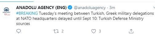 “Η συνάντηση της Τρίτης μεταξύ τουρκικών και ελληνικών στρατιωτικών αντιπροσωπειών στα κεντρικά γραφεία του ΝΑΤΟ καθυστέρησε έως τις 10 Σεπτεμβρίου” αναφέρει το Anadolu επικαλούμενο πηγές από το υπουργείο Άμυνας της Τουρκίας.