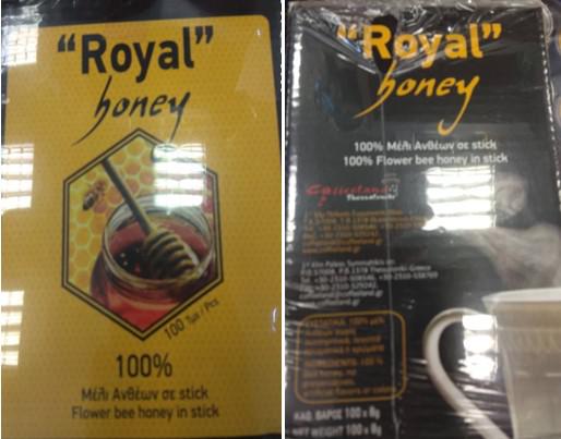 Πρόκειται για 100% μέλι ανθέων σε stick – συσκευασία των 800 γραμμαρίων (100 τεμάχια των 8 γραμμαρίων έκαστο) με την εμπορική ονομασία «Royal honey» σε χάρτινη κλειστή συσκευασία 800 γρ, με αριθμό παρτίδας L06022020 και ανάλωση κατά προτίμηση πριν από: 06/01/2022.