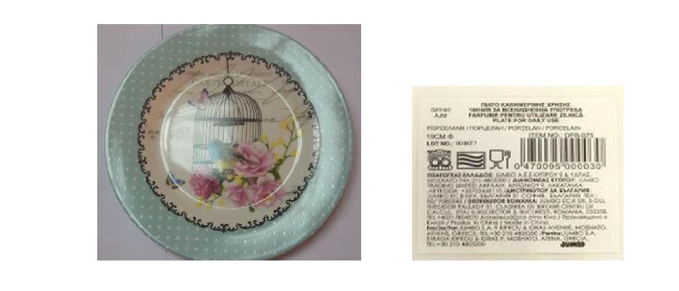 Πρόκειται για πιάτο καθημερινής χρήσης από πορσελάνη με διάμετρο 19cm, προέλευσης Κίνας, με κωδικό προϊόντος ITEMNO.:DFB-075, αριθμό παρτίδας 16HKF7 και αριθμό γραμμοκώδικα 0470095000030. Το εν λόγω προϊόν, διατέθηκε από την εταιρεία “Jumbo A.Ε.Ε.”.