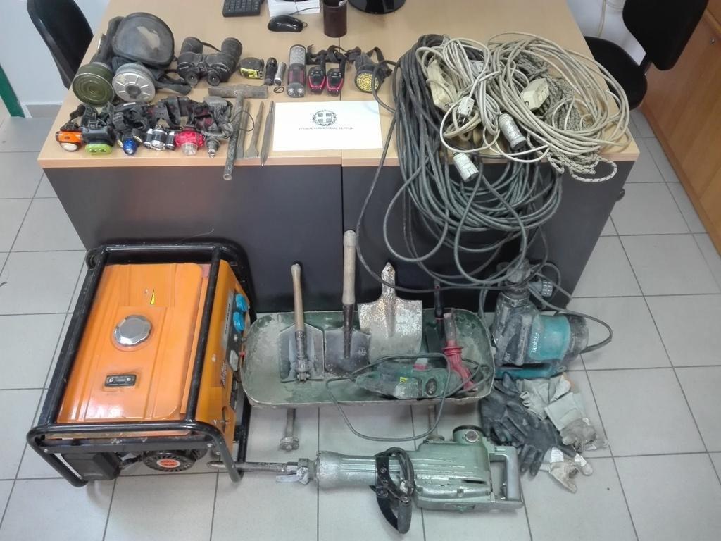 Στο χώρο της παράνομης ανασκαφής εντοπίσθηκαν μέσα και εργαλεία που χρησιμοποιούσαν και συγκεκριμένα βρέθηκαν και κατασχέθηκαν: