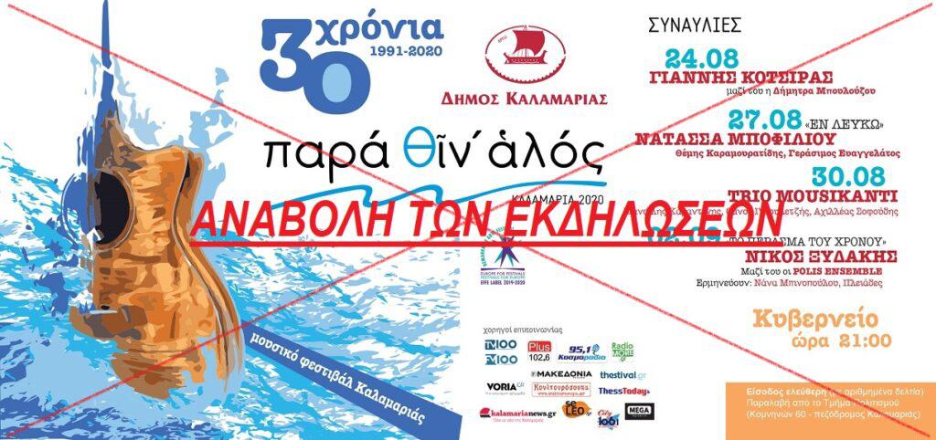 Μετά από τηλεφωνική επικοινωνία του Δημάρχου Καλαμαριάς Γιάννη Δαρδαμανέλη, με τον υπουργό Πολιτικής Προστασίας Νίκο Χαρδαλιά και δεδομένης της αύξησης του αριθμού των κρουσμάτων στη χώρα μας τις τελευταίες ημέρες, ο Δήμος Καλαμαριάς αναστέλλει τις εκδηλώσεις του Παρά Θίν Αλός για το 2020, για λόγους προάσπισης και διαφύλαξης της δημόσιας υγείας.