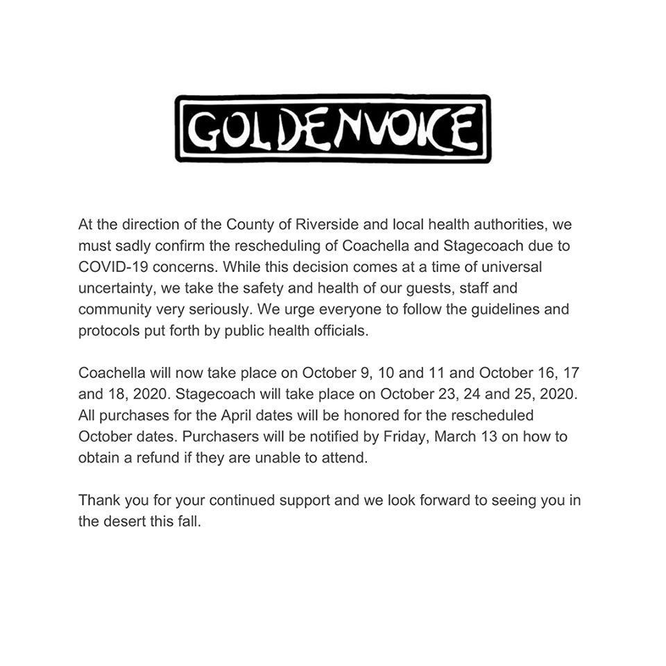 Το Coachella που ήταν προγραμματισμένο για τα σαββατοκύριακα 10-12 και 17-19 Απριλίου, θα πραγματοποιηθεί τελικά στις 9-11 και 16-18 Οκτωβρίου όπως ανακοίνωσαν οι διοργανωτές του μεγάλου διάσημου μουσικού φεστιβάλ.