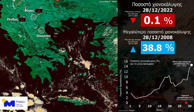 Τα τελευταία 17 χρόνια, στα τέλη Δεκεμβρίου ο μέσος όρος της έκτασης χιονοκάλυψης είναι περίπου 14% της συνολικής χερσαίας έκτασης της χώρας μας, όμως φέτος στις 28/12 το ποσοστό ήταν μόλις 0,1%.