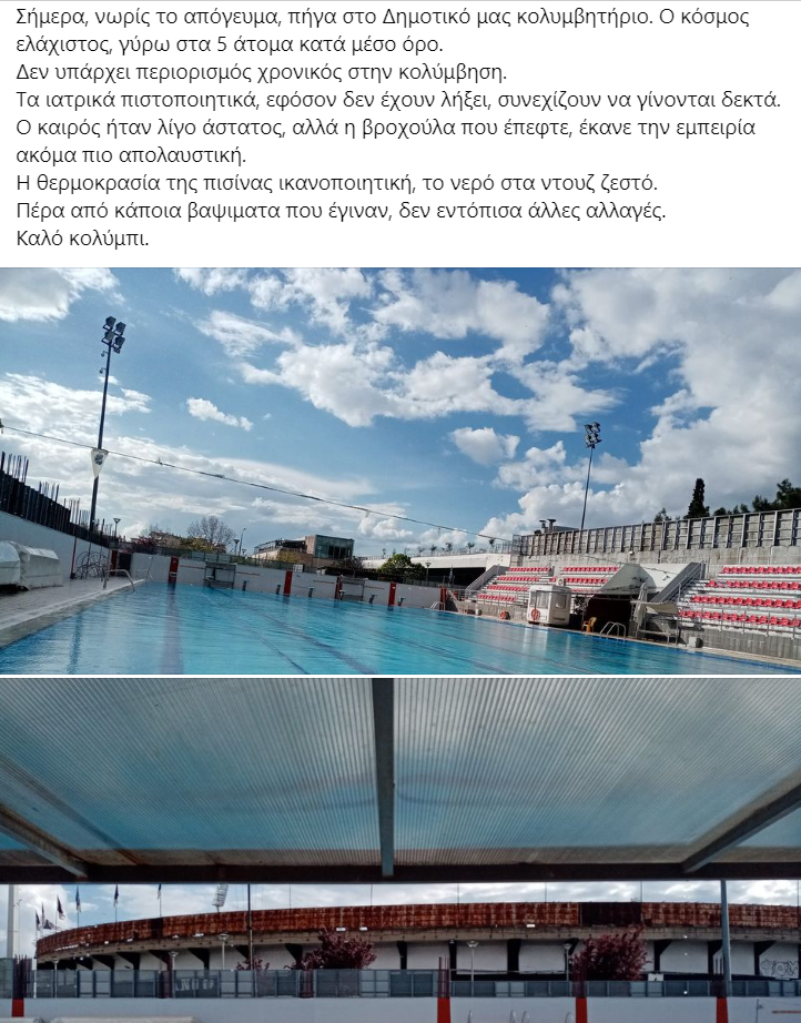 Σήμερα πάντως, οι πρώτοι που επισκέφτηκαν το Κολυμβητήριο, αναφέρουν πως ενώ είχε ακόμα ελάχιστο κόσμο, λόγω και της βροχής, ήταν η εμπειρία ακόμα πιο απολαυστική