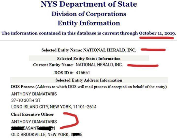 Στην βάση δεδομένων της Πολιτείας (State) Νέας Υόρκης, όπου είναι δηλωμένη η εταιρία ”Νational Herald, Inc.” (”Εθνικός Κήρυξ”) και ανανεώνεται κάθε Παρασκευή βράδυ, η τελευταία αναφορά (11 Οκτωβρίου 2019) είναι η ακόλουθη: