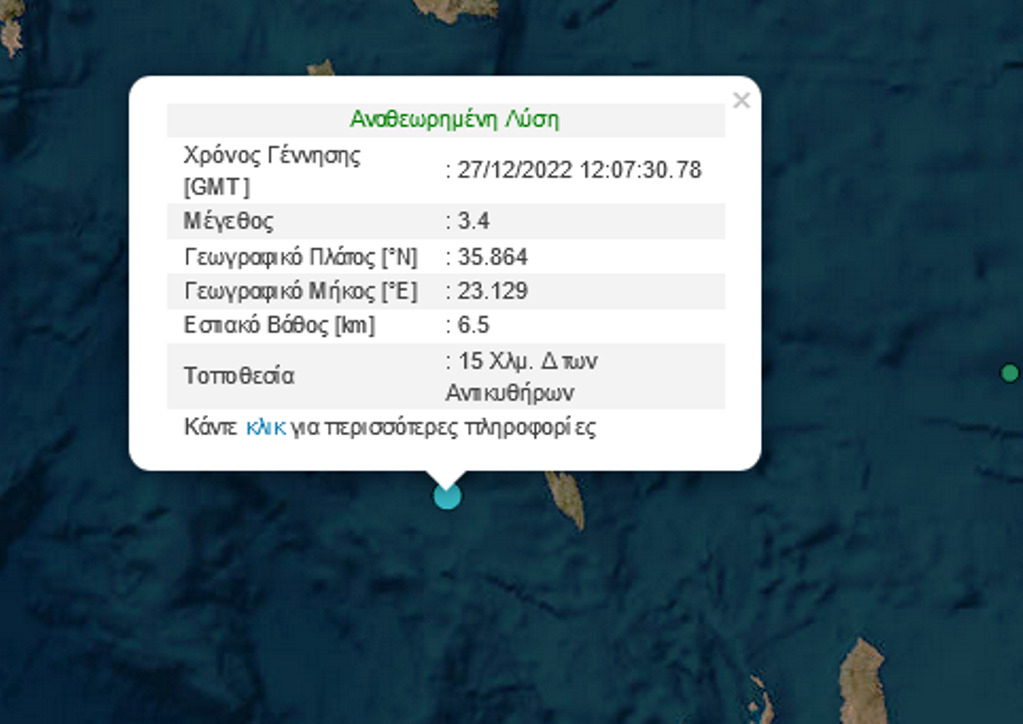 Σεισμός μεγέθους 3,4 βαθμών της κλίμακας Ρίχτερ σημειώθηκε έξι χιλιόμετρα νοτιοδυτικά των Αντικυθήρων, σύμφωνα με το Γεωδυναμικό Ινστιτούτο του Εθνικού Αστεροσκοπείου Αθηνών.