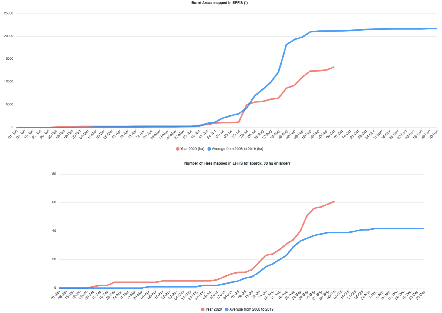Εικόνα 1. Η πορεία της αθροιστικής καμένης έκτασης (επάνω) και του αριθμού των πυρκαγιών (κάτω) στην Ελλάδα από 01/01 έως και 06/10/2020 (κόκκινες γραμμές), σε σύγκριση με τους αντίστοιχους μέσους όρους της περιόδου 2008 – 2019 (μπλε γραμμές).