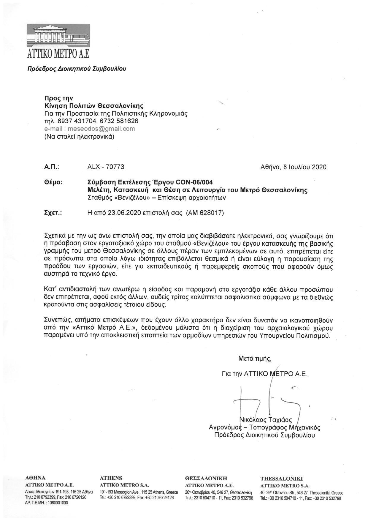 Η Κίνηση Πολιτών Θεσσαλονίκης απέστειλε αίτημα στην Αττικό Μετρό ΑΕ για να επισκεφτούν τα μέλη της τον αρχαιολογικό χώρο στο σταθμό Βενιζέλου.