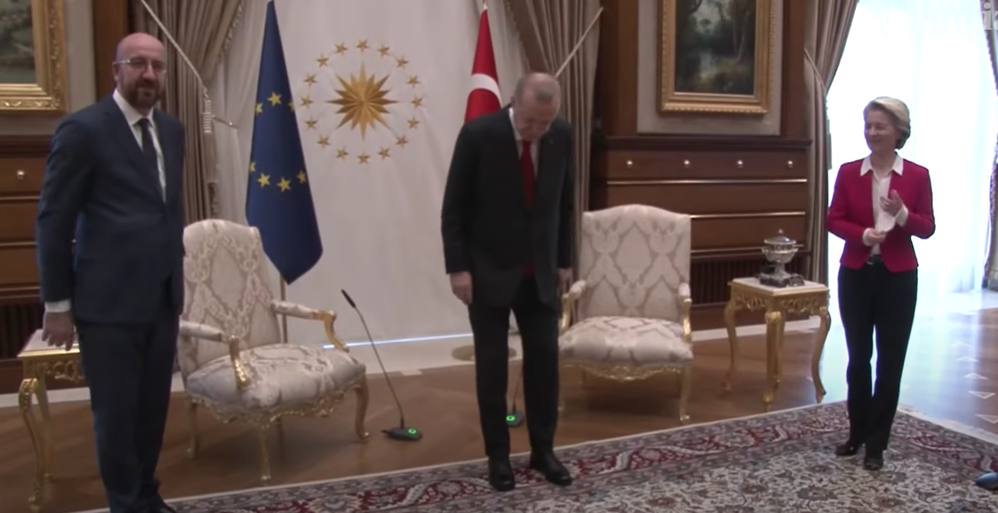 Η Ούρσουλα φον ντερ Λάιεν δεν έκρυψε την ενόχλησή της για όλα όσα διαδραματίστηκαν μέσα στο Προεδρικό Μέγαρο. Υπενθυμίζουμε ότι ο πρόεδρος της Τουρκίας Ρετζέπ Ταγίπ Ερντογάν δεν τοποθέτησε καρέκλα για να καθίσει η Πρόεδρος της Ευρωπαϊκής Επιτροπής. Η Ούρσουλα φον ντερ Λάιεν τοποθετήθηκε για το περιστατικό δια του εκπροσώπου της.