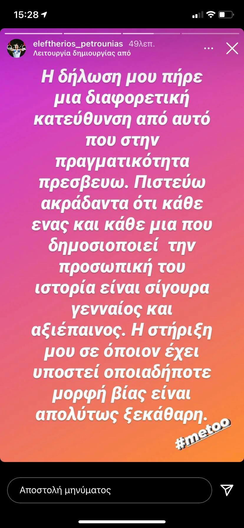 Ο Έλληνας Ολυμπιονίκης, Λευτέρης Πετρούνιας, με μια δήλωσή του την οποία και δημοσιοποίησε σε story στο λογαριασμό του στο instagram, έκανε λόγο για διαφορετική κατεύθυνση που πήρε η τοποθέτηση του για το #metoo από όσα πρεσβεύει.