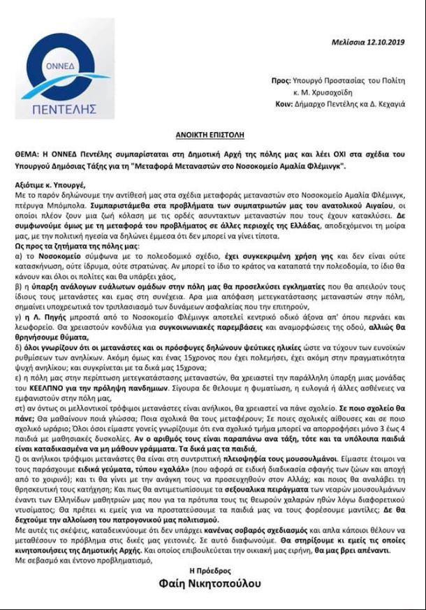 Νωρίτερα, σε ανάρτησή της σε ιστοσελίδα κοινωνικής δικτύωσης, η οργάνωση ανέφερε τα εξής: «Η θέση της ΟΝΝΕΔ είναι σαφής και ανυποχώρητη: είμαστε δίπλα στην Κυβέρνηση στη διαχείριση τόσο του προσφυγικού, όσο και του μεταναστευτικού με τρόπο δίκαιο και αποτελεσματικό, χωρίς φωνές εντυπωσιασμού είτε από τη μία, είτε από την άλλη πλευρά. Τα κρίσιμα ζητήματα απαιτούν μέτρο και νηφαλιότητα. Η επιστολή της ΟΝΝΕΔ Πεντέλης δεν υπηρετεί αυτή την κατεύθυνση και για το λόγο αυτό θα κινηθούν οι απαραίτητες διαδικασίες ώστε οι αρμόδιοι να δώσουν άμεσα εξηγήσεις. Τέλος, ευχαριστούμε το κόμμα της Μόριας και της Ειδομένης για το σημερινό μάθημα ανθρωπισμού. Το υποκριτικό τους ενδιαφέρον για ένα ζήτημα που αφορά ανθρώπους και τοπικές κοινωνίες είναι εδώ και χρόνια διαπιστωμένο με πικρό τρόπο, δεκάδες νεκρούς και αμέτρητα προβλήματα».