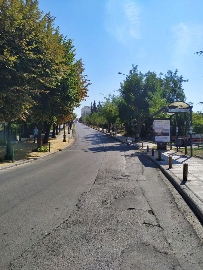 Ξεκινώντας την αυτοψία στην περιοχή από την Γεωργίου Βιζυηνού, ένα πρώτο δώρο- έκπληξη είναι μετά βεβαιότητας το οδόστρωμα. Η όψη του δίνει την αίσθηση πως είναι καλύτερο- ανεξαρτήτως ηλικίας- να λαχανιάσουμε κινούμενοι πεζή παρά με Ι.Χ ή με τα μικρά 15, 16 του ΟΑΣΘ.