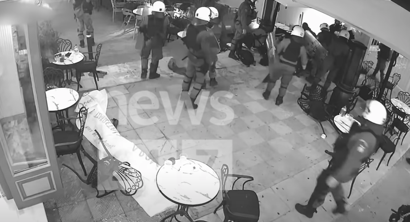 Ξύλο μπροστά σε 5χρονο κορίτσι στην καφετέρια Από το βίντεο-ντοκουμέντο που φέρνει στη δημοσιότητα το NEWS 24/7, οι πρώτες δύο λήψεις αποτυπώνουν την -ίδια- σκηνή αστυνομικής βίας που εκτυλίχθηκε στον πεζόδρομο, έξω από την καφετέρια. Την ίδια ώρα, όπως δείχνει η τρίτη λήψη, ανθρωποκυνηγητό και “τυφλά” χτυπήματα από τους αστυνομικούς ακολουθούν και εντός της καφετέριας, μπροστά στα μάτια ενός 5χρονου κοριτσιού.
