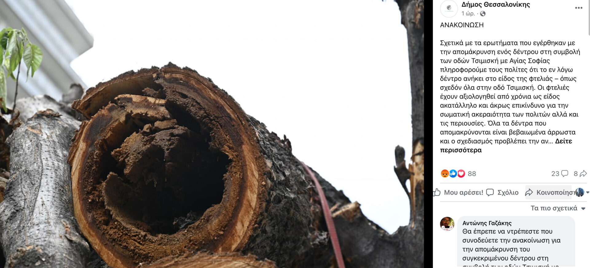 Στο μεταξύ σάλος στα social από την αποκάλυψη στην οποία προέβη ο δημοτικός σύμβουλος Αντώνης Γαζάκης ότι η εικόνα με την οποία απάντησε ο δήμος Θεσσαλονίκης στην οργή των πολιτών για το κόψιμο των δέντρων στην Τσιμισκή δεν ήταν από τα δέντρα της Τσιμισκή.