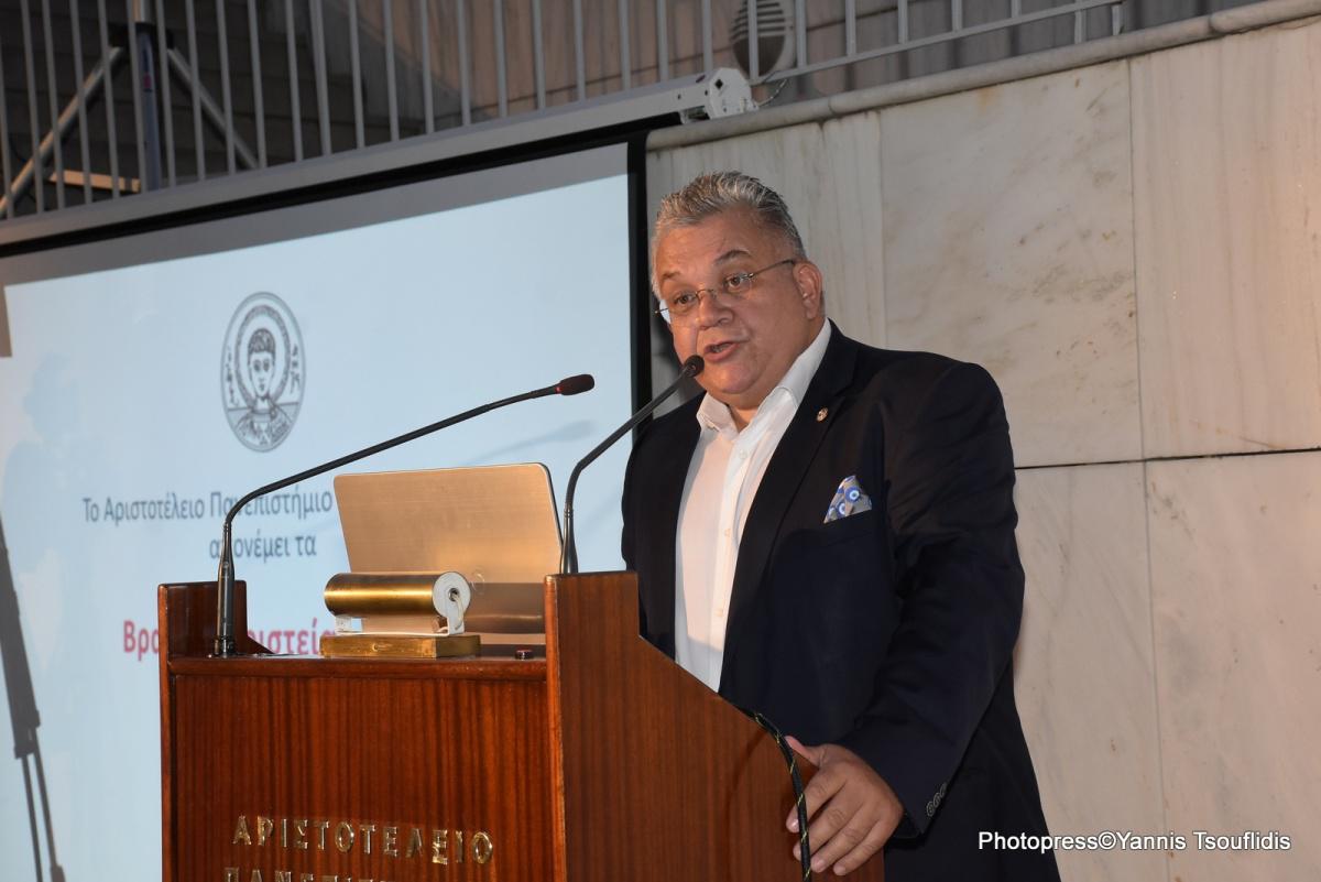 Στον χαιρετισμό του, ο Πρύτανης του ΑΠΘ, Καθηγητής Νικόλαος Γ. Παπαϊωάννου, υπογράμμισε ότι «παρά τους δύσκολους καιρούς, η σκληρή δουλειά και το άριστο έργο δεν παύουν να ριζώνουν στον τόπο μας και να δρέπουμε τους καρπούς τους». Ο κ. Παπαϊωάννου ευχαρίστησε τους βραβευομένους που «επίμονα και επίπονα παράγετε γνώση, χαρτογραφείτε την καινοτομία, καλλιεργείτε την τέχνη, ασκείτε τον εθελοντισμό και στηρίζετε το Αριστοτέλειο Πανεπιστήμιο από κάθε πιθανή θέση».