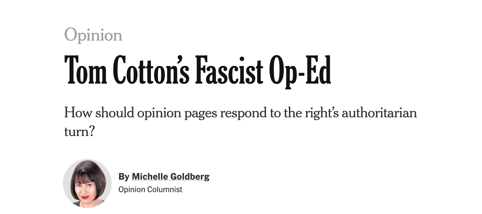 Στο άρθρο, που δημοσιεύθηκε στις 3 Ιουνίου, ο γερουσιαστής του Αρκάνσας Τομ Κότον ζητούσε να γίνει «μια σαρωτική επίδειξη δύναμης» για να «αποκατασταθεί η τάξη στους δρόμους μας», προκαλώντας επικρίσεις τόσο από αναγνώστες όσο και από τους δημοσιογράφους της εφημερίδας.