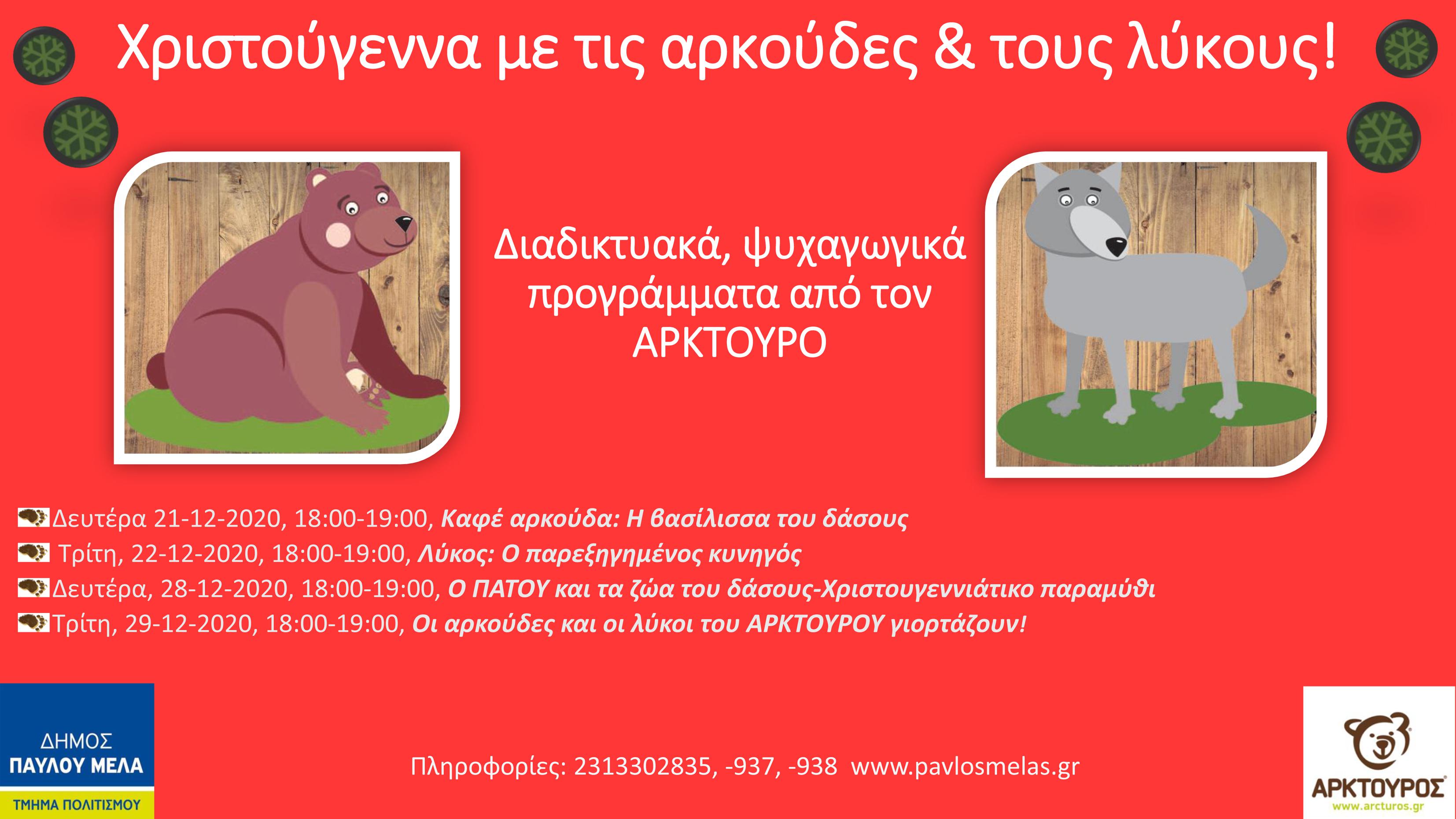 ➢Τρίτη 29/12/2020: 18:00-19:00, Οι αρκούδες και οι λύκοι του ΑΡΚΤΟΥΡΟΥ γιορτάζουν! Σύνδεσμος https://us05web.zoom.us/j/4201507362?pwd=dW5HZDdRK05mUXBxRWFXRlJRVEJ1dz09 Meeting ID: 420 150 7362, Passcode: N9DTkj