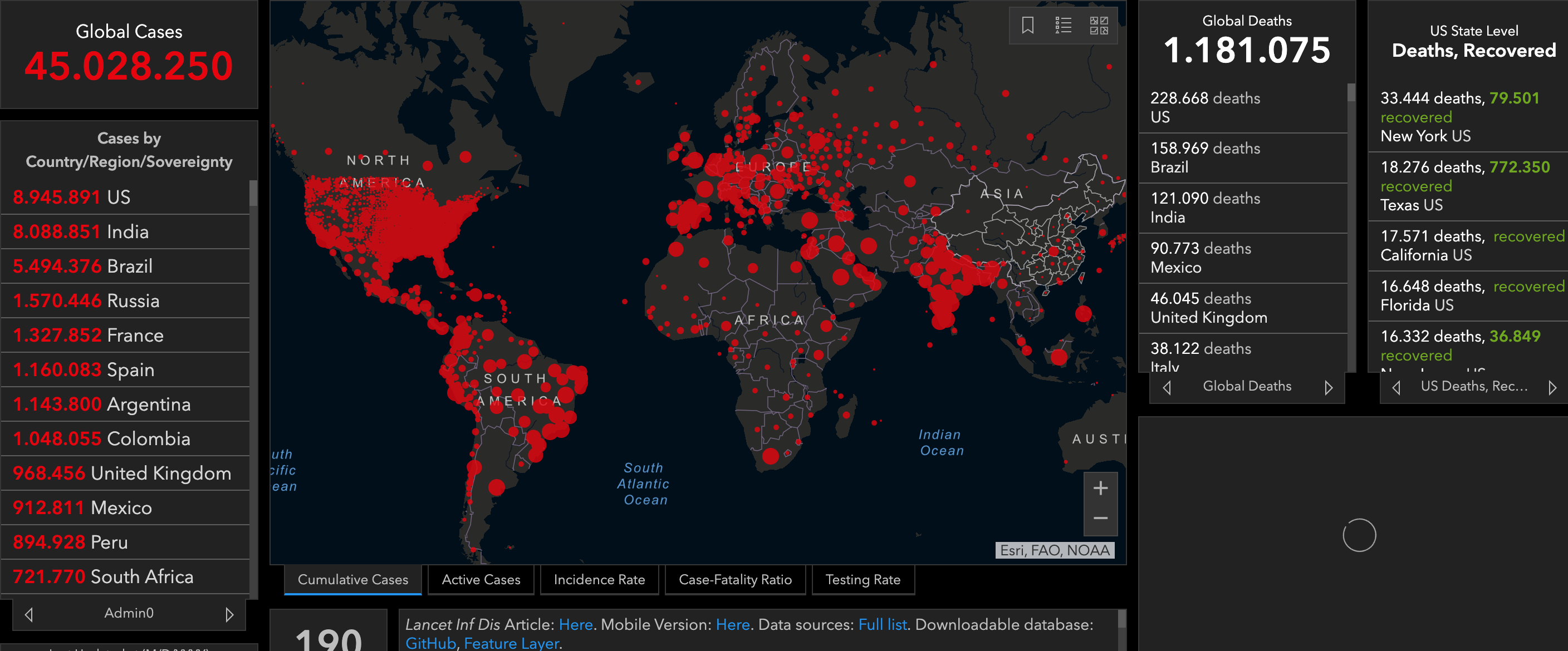 Μέχρι σήμερα, από την αρχή της πανδημίας, έχουν μολυνθεί από τον νέο κορωνοϊό 44,7 εκατομμύρια άνθρωποι και από αυτούς 1,17 εκατομμύριο πέθαναν.