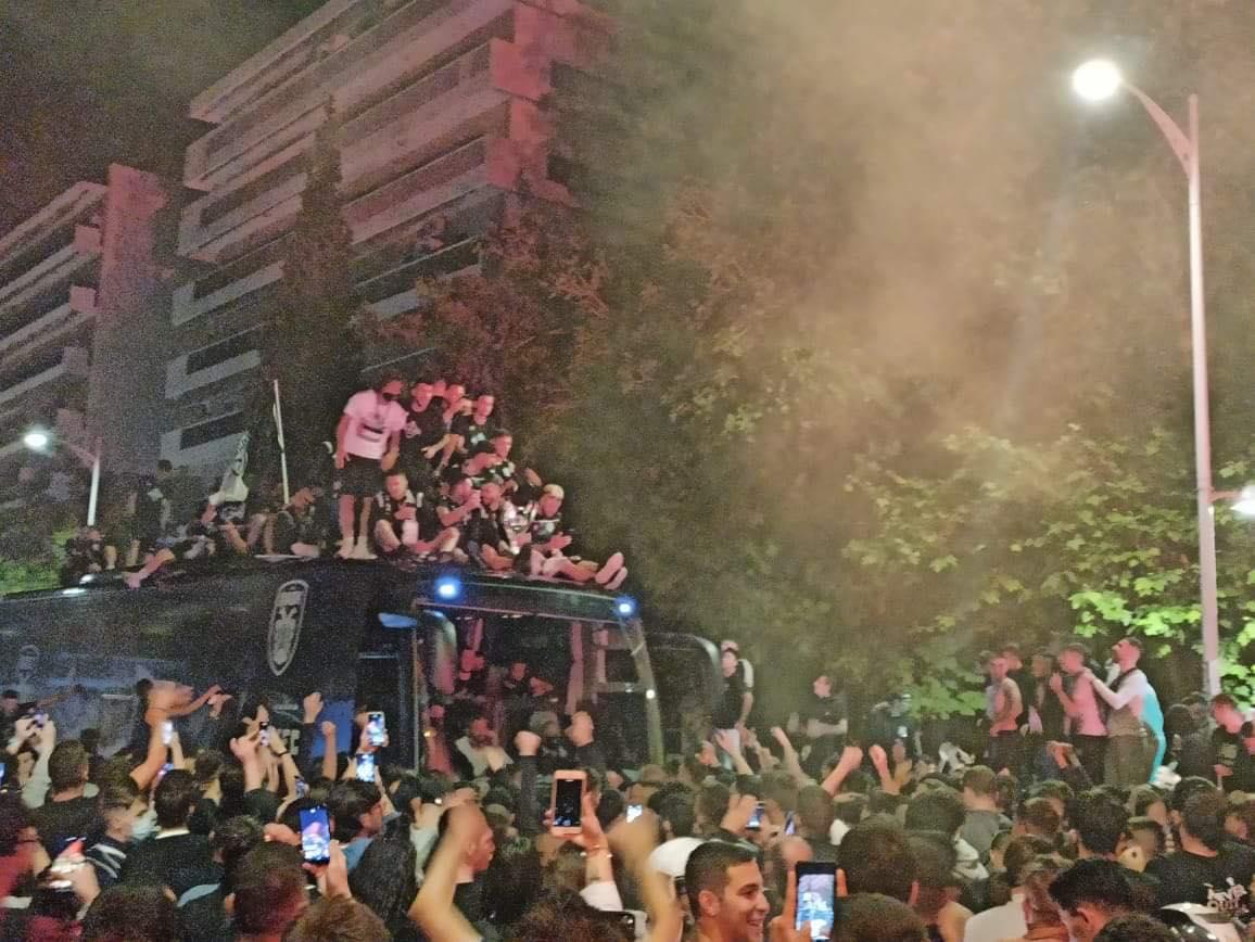 Το πούλμαν του ΠΑΟΚ έφτασε μέσω επευφημιών στο κέντρο της πόλης όπου τα βίντεο μαρτυρούν ξέφρενο πάρτι μέχρι τις 06.00 της Κυριακής.