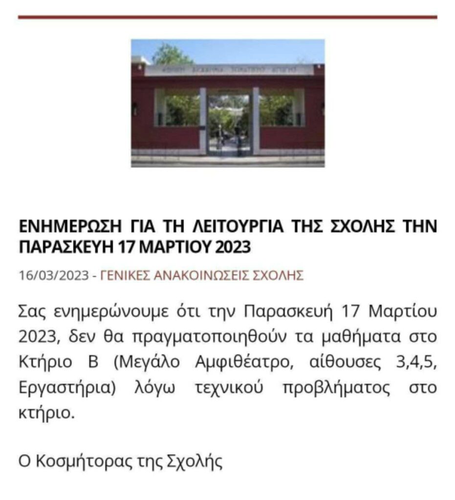 Εξαιτίας του συμβάντος, σήμερα Παρασκευή 17 Μαρτίου, δεν πραγματοποιήθηκαν μαθήματα στο κτίριο Β της σχολής.