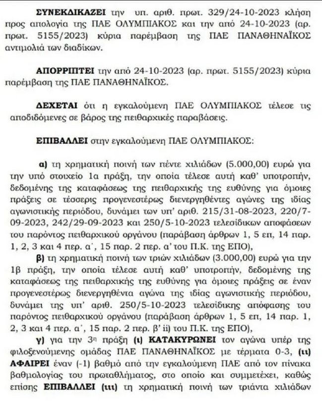 Δείτε τι αναφέρει η απόφαση για την ποινή στον Ολυμπιακό: